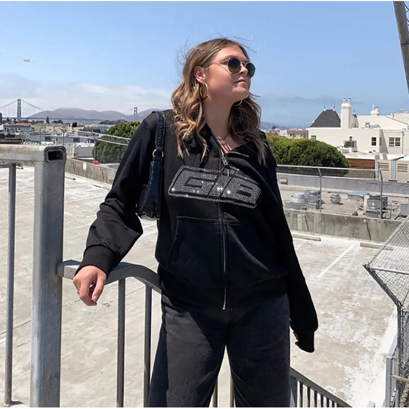 Толстовки Y2K большого размера, на молнии, с надписью, винтажные, однотонные, черные, Осенние