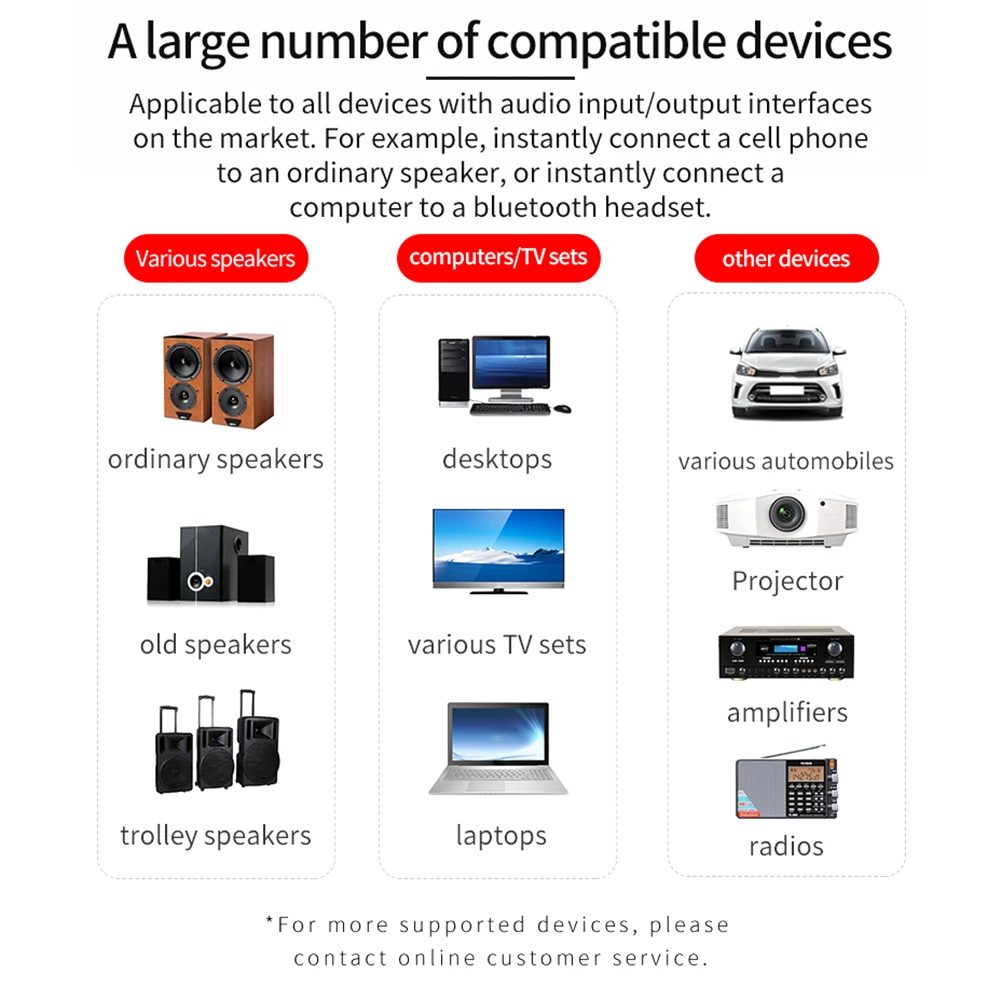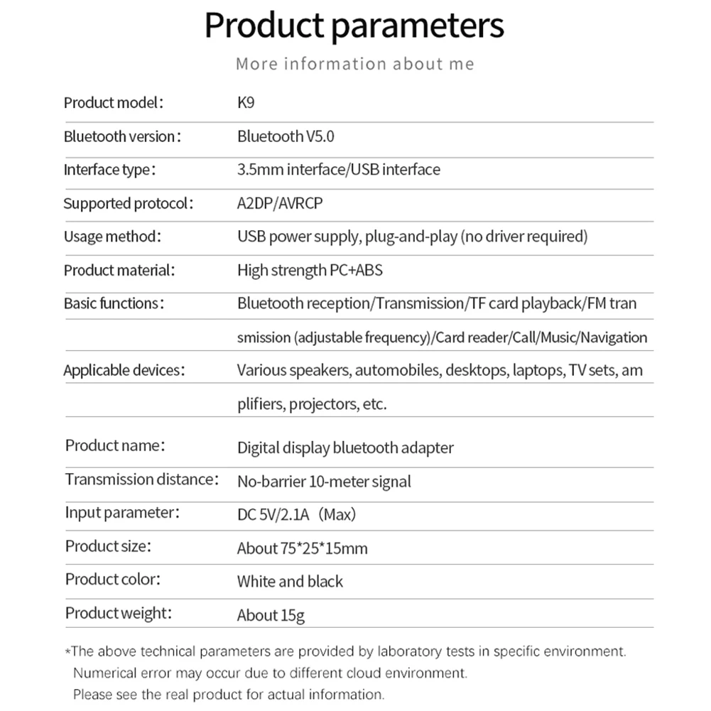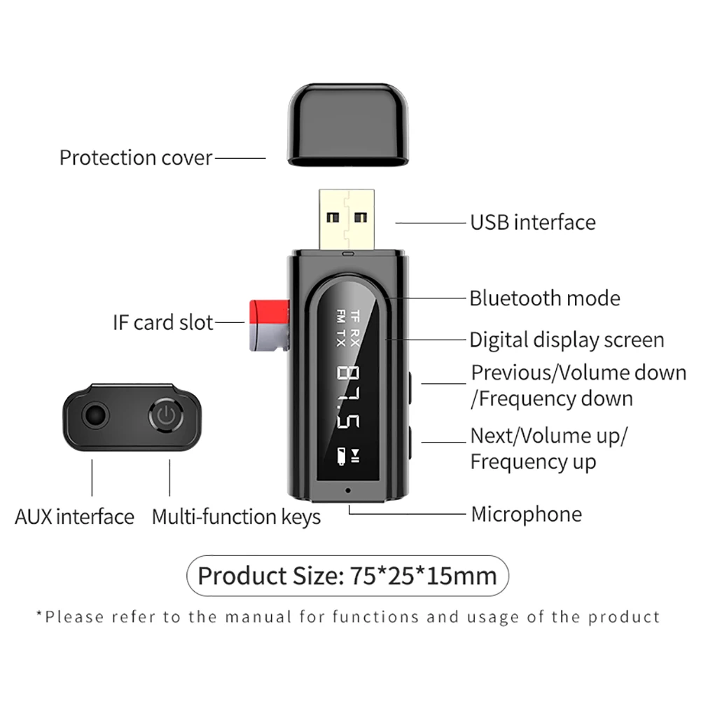 Точки пули:1. Чип Bluetooth 5,0: Приемник использует чип Bluetooth 5,0 со светодиодным цифровым дисплеем, рабочий статус четко виден.2. Основные функции: Автомобильный светодиодный Передатчик оснащен Bluetooth приемом, передачей Bluetooth, fm-передачей, воспроизведением tf-карт, кардридером, внешней звуковой картой.3. FM передача: Автомобильный светодиодный передатчик поддерживает AUX + FM двойной выход, FM передача, Регулируемая частота (87,5 ~ 108 МГц), стабильный сигнал, отсутствие шума и помех.4. Функция считывания карт TF: функция считывания карт TF, используется для копирования данных и других операций на компьютере, эффективное расстояние передачи данных по Bluetooth составляет 10 метров.5. Качество стереозвука: светодиодный автомобильный передатчик встроен в чип декодера высокого качества, высокое качество стереозвука (поддержка сравнения качества звука аналогичного продукта).Особенности:1. Новый дизайн: bluetooth-приемник с светодиодный-дисплеем.2. Приемник Bluetooth 5,0: установлен с Bluetooth 5. Чип, Новый Беспроводной приемный приемник VIKEFON имеет непревзойденную производительность с более быстрой скоростью передачи 2x, более высокой стабильностью подключения, на 10 м выше, чем знак предыдущей версии.3. Передатчик приемник режим: конструкция «2 в 1, с помощью этого беспроводного, адаптер, можете отправить нам сообщение, вы можете отправить нам и принимает все звуковые свободно и легко. Передатчик позволяет вашему телевизору, av-ресиверу, радио-и мобильному устройству устройства yourBluetoothheadphonesor speakers; Thereceiverallowsnon-tacon/PC.4. Fm-передатчик: (87,5-108 МГц) светодиодный дисплей.5. С микрофоном: свободные руки при звонке, говорящая на пике во время вождения.6. Кард-ридер и передача данных: можно распознать tf-карту.Характеристики:Интерфейс: 3,5 ммВход: параметр: DC5V / 2.1AПоддержка: протокол: A2DP / AVRCPРазмер: около 6,7*2,2*1,2 мм/0,26*0,08 * 0.05inМатериал: Поликарбонат + АБС-пластик высокой интенсивностиВес: около 15 г/100 гОсновные функции: прием Bluetooth, fm-радио (87,5-108 МГц), передача Bluetooth, воспроизведение tf-карт и хранение данныхПоддержка устройств: мобильный телефон/автомобиль/планшет/компьютер/проводной динамик/усилитель/проекторУпаковочный лист:1 bluetooth-передатчик и приемник1 х кабель аудио 3,5 мм1 X Руководство пользователя