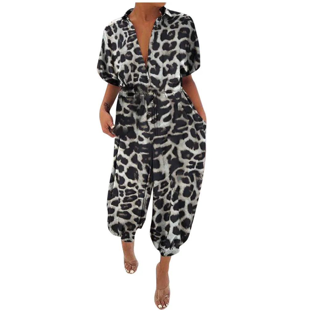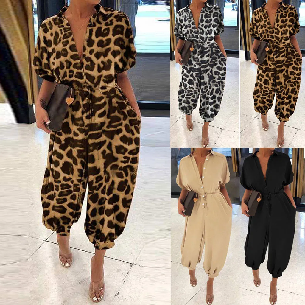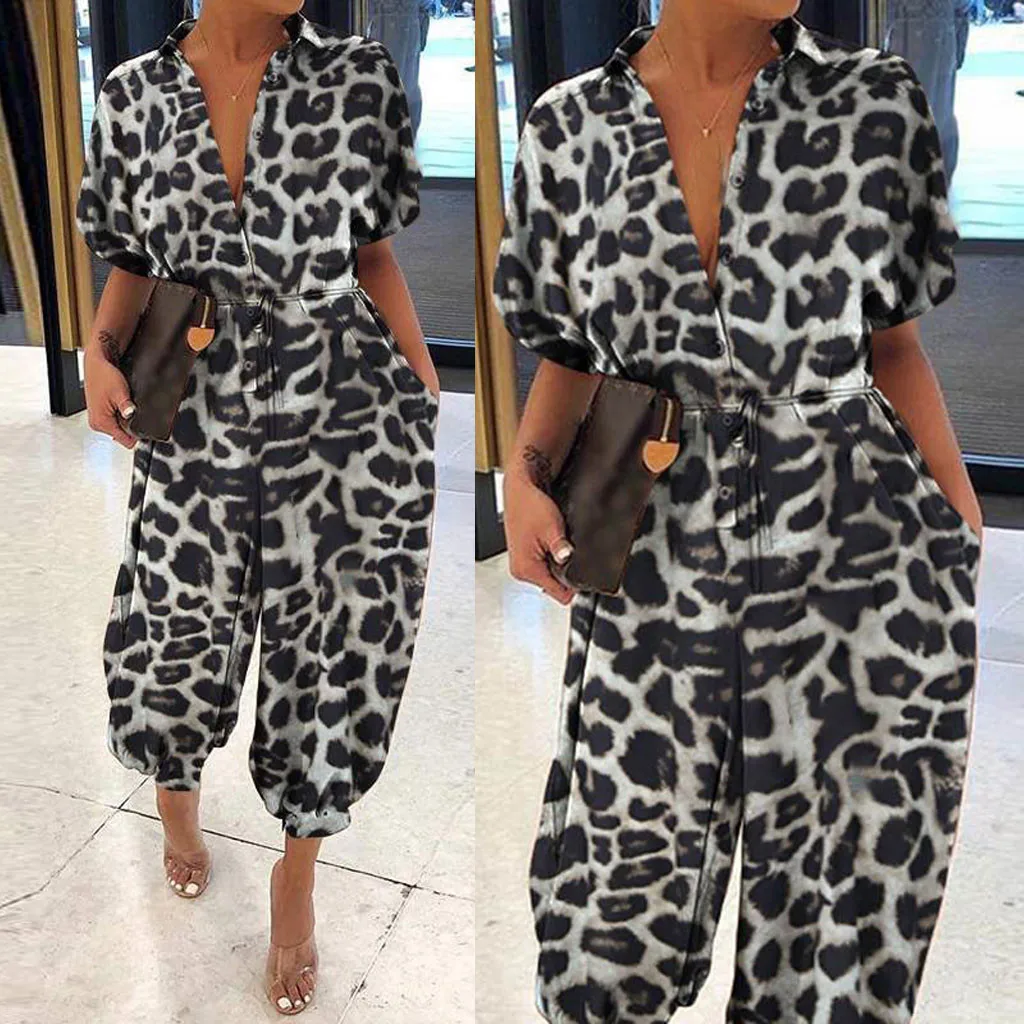 Женский леопардовый комбинезон, облегающий боди с отложным воротником и длинными пуговицами, комбинезоны большого размера с коротким рукавом, 30h