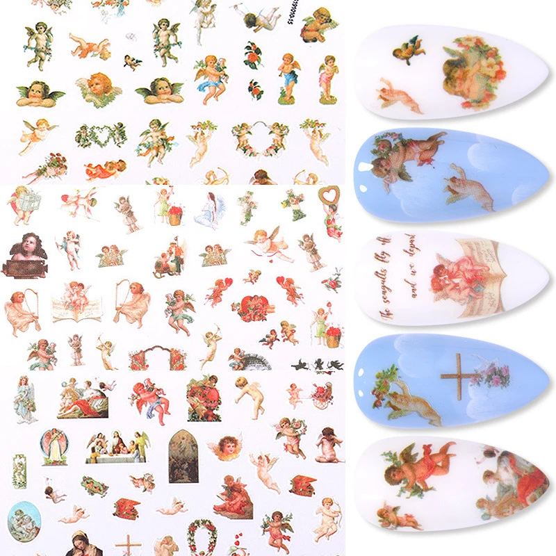 1 шт. наклейки для дизайна ногтей с Купидоном, маленьким ангелом, клейкие украшения для дизайна ногтей, винтажные наклейки для ногтей с узором в виде роз и букв