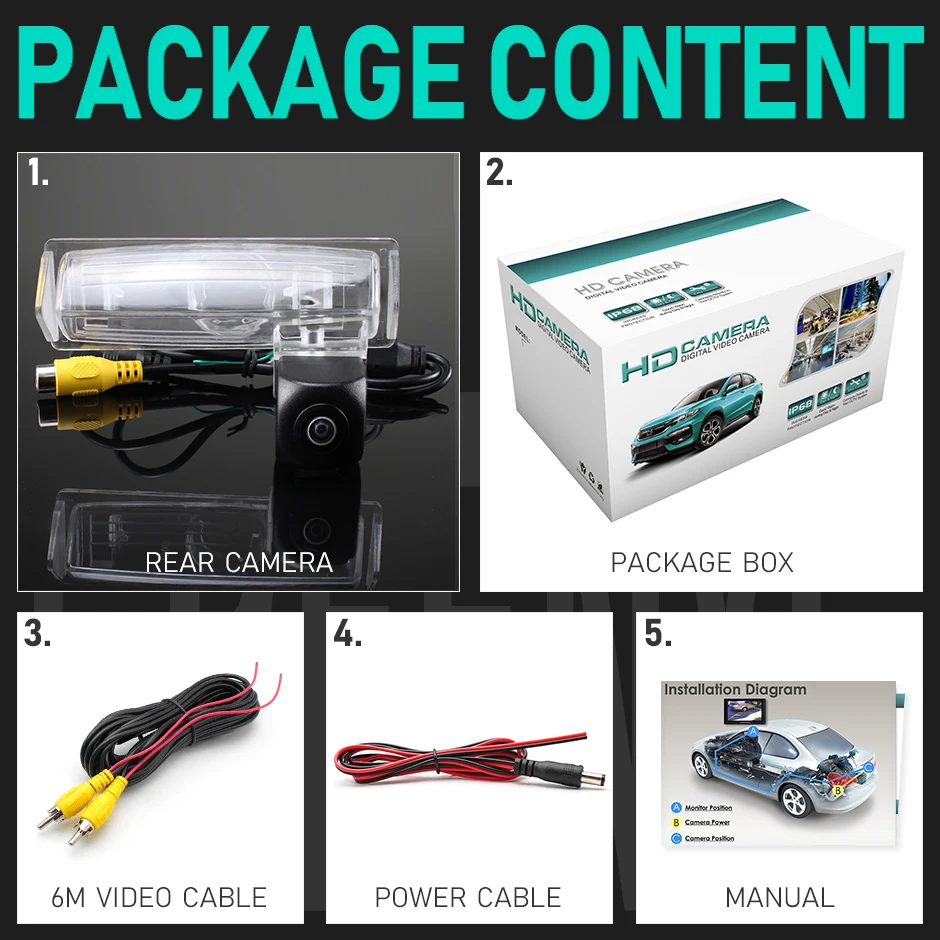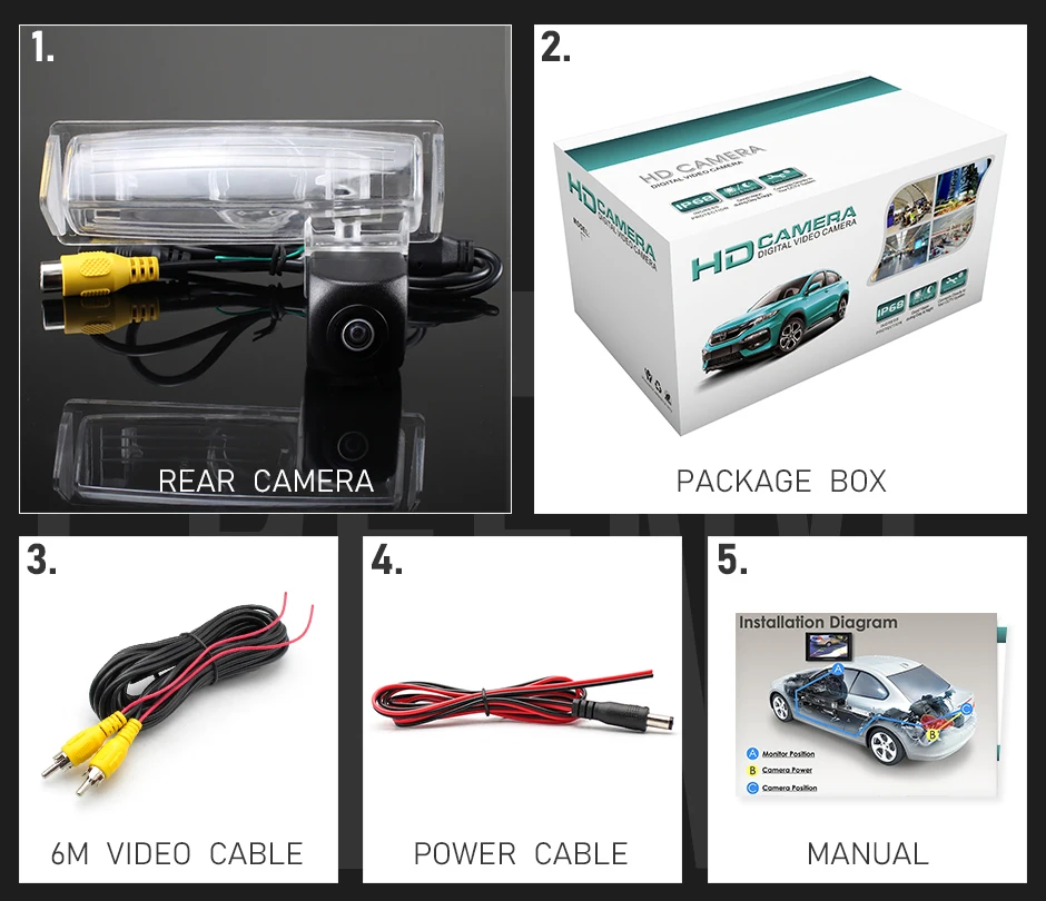 1. Rear camera 2. Package box 3. Video cable (6m) 4. Power cable 5. Manual