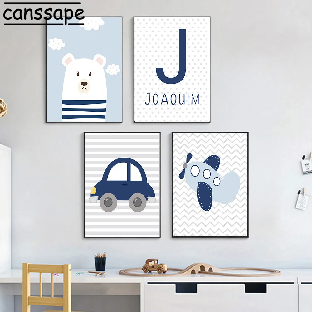Игрушечный автомобиль самолет Wall Art Плакаты пользовательское имя холст для живописи принт для детской постер с изображением медведя Nordic настенные картины для детской комнаты настенный Декор