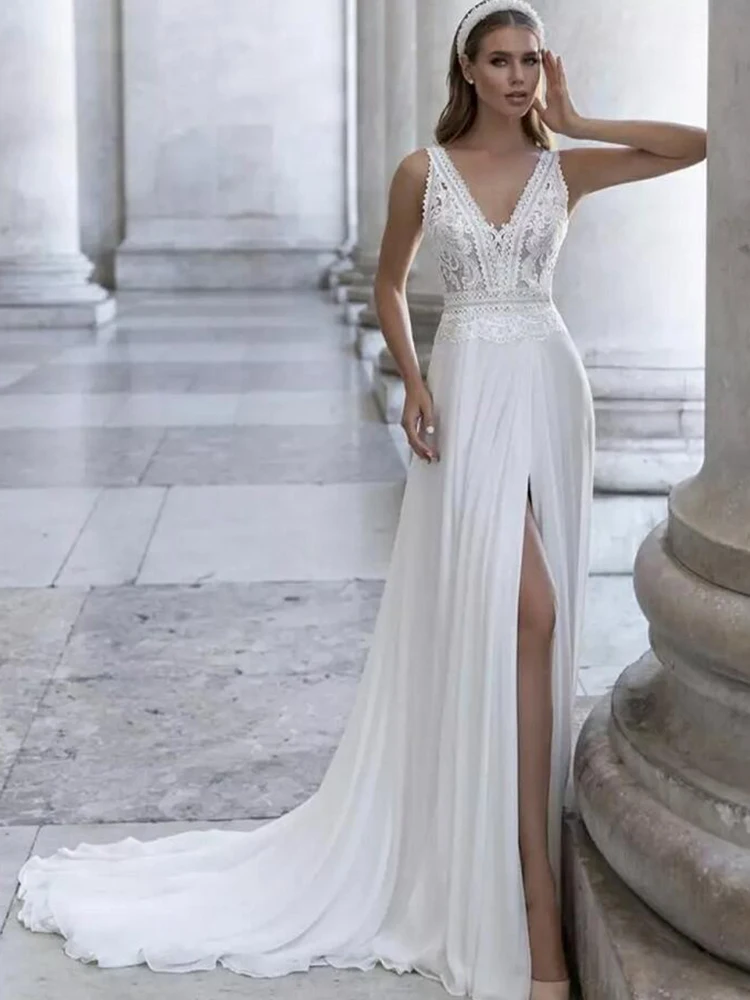 Очаровательное свадебное платье с разрезом по бокам, 2021, ТРАПЕЦИЕВИДНОЕ, с V-образным вырезом, с пуговицами, со шлейфом, Кружева Аппликации с открытой спиной