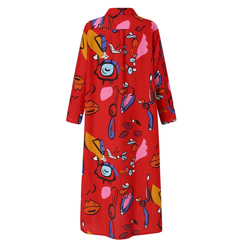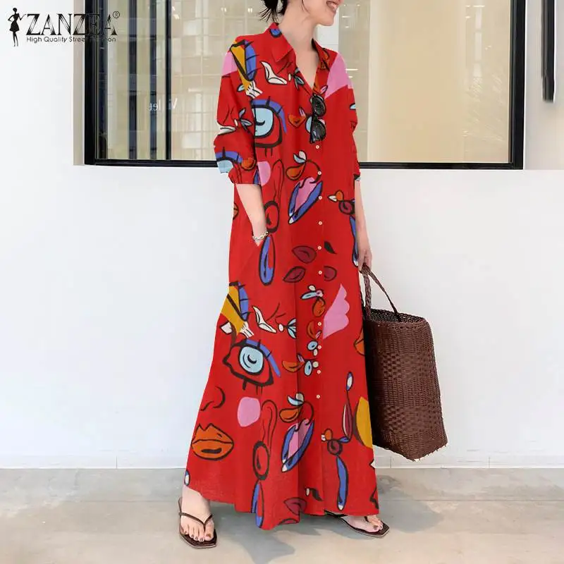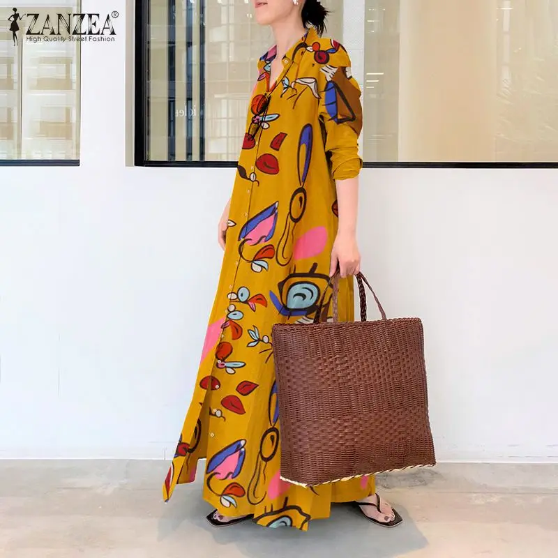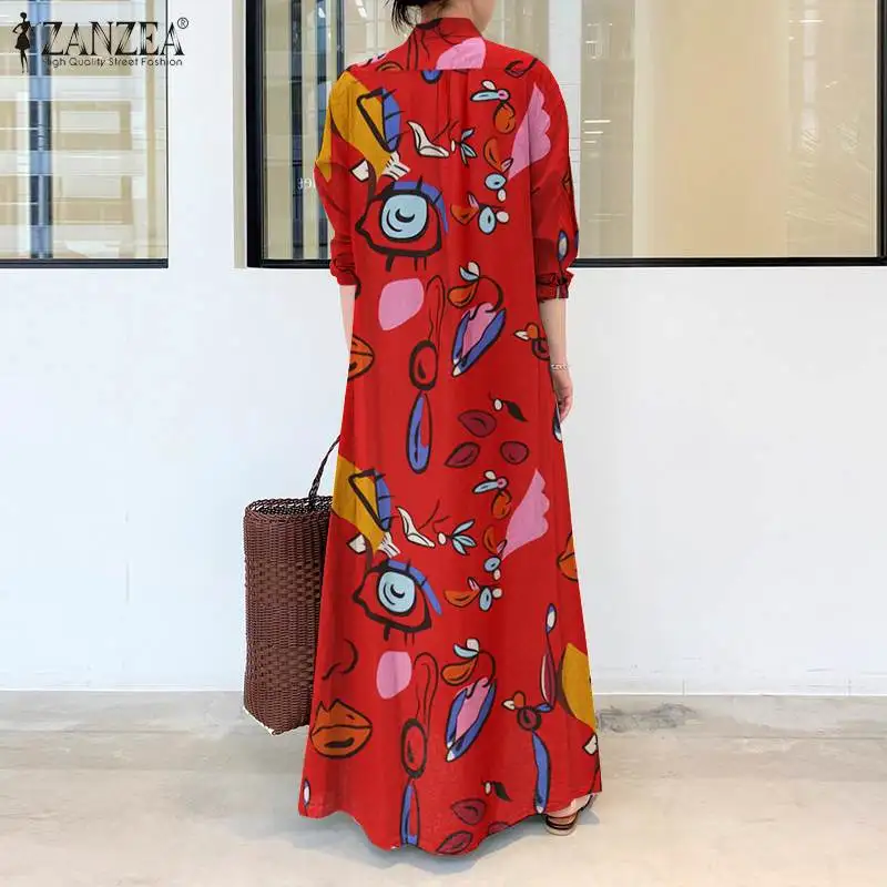 Женское длинное платье-рубашка ZANZEA с отложным воротником, весенний Богемный Макси Сарафан с длинным рукавом и принтом, винтажные свободные платья, 2021