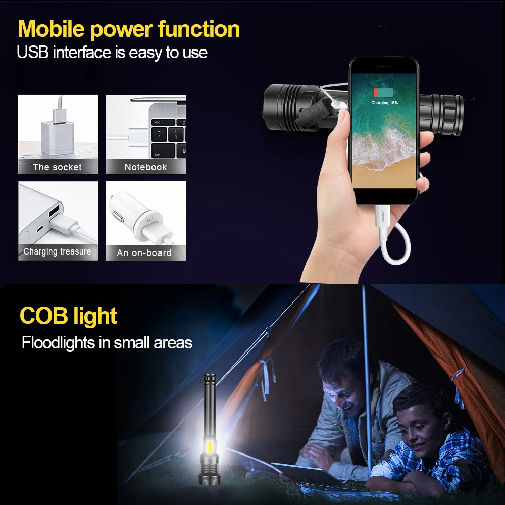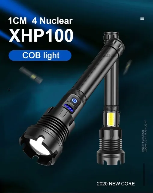 ※ Мы ориентируемся на качество продукции и обновления. Предоставление покупателям новейших и высококачественных продуктов-наша цель обслуживания. Поэтому мы разработали фитиль XHP100 + COB для этого фонарика, который является самым мощным и ярким фитилем в AliExpress году. Его яркость выше вашего воображения. Он использует аккумулятор 2*18650 или 2*26650, дальность освещения более 1000 метров, подходит Предупреждение о походе, скалолазании, строительстве, ходьбе, обслуживании дома, поиске и rescu и т. д., фонарик XHP100 имеет 7 режимов, пожалуйста, проверьте информацию о продукте!