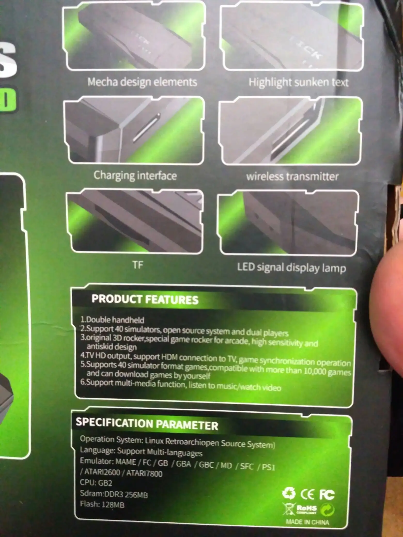 Если кому-то интересны технические характеристики приложил фото с коробки. Есть небольшие проблемы с подключением 2 джойстиков одновременно, если их включать сразу то всё норм, если работает один, а через какое-то время включать 2-й то не факт что приставка его увидит, но это мелочи в целом всё хорошо