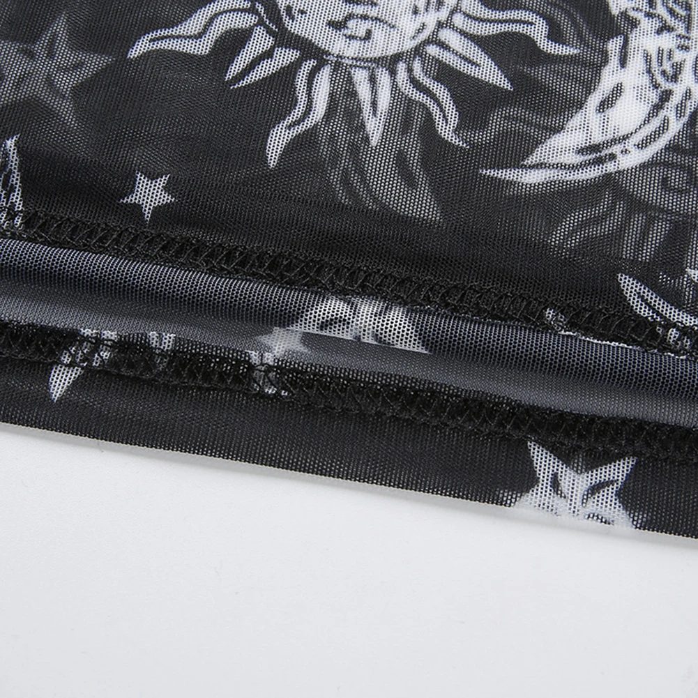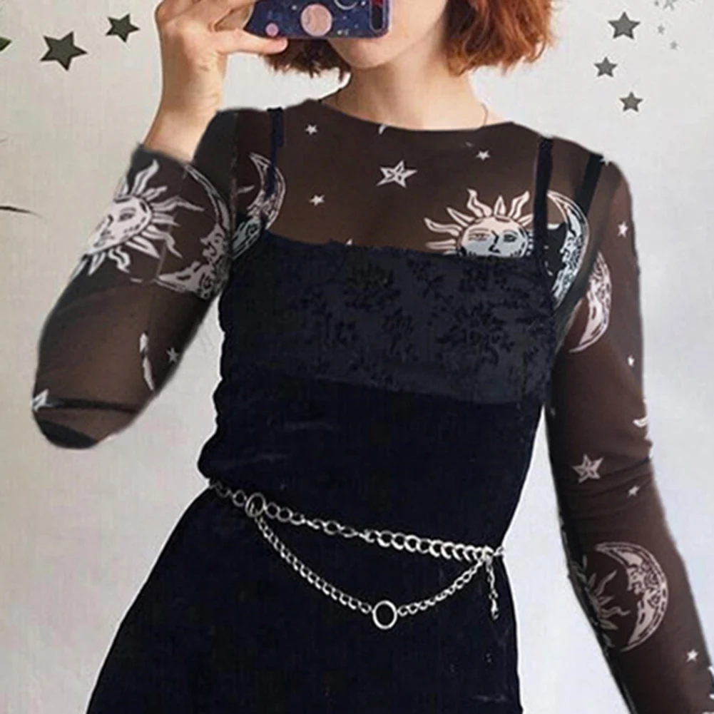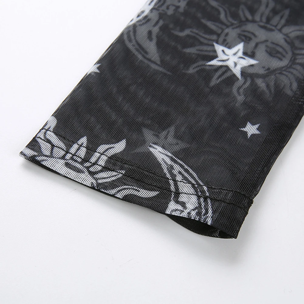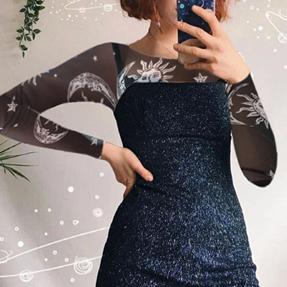 Женские Модные сетчатые прозрачные кроп-топы с круглым вырезом и принтом Луны и звезд, весенние женские пикантные повседневные футболки с длинным рукавом
