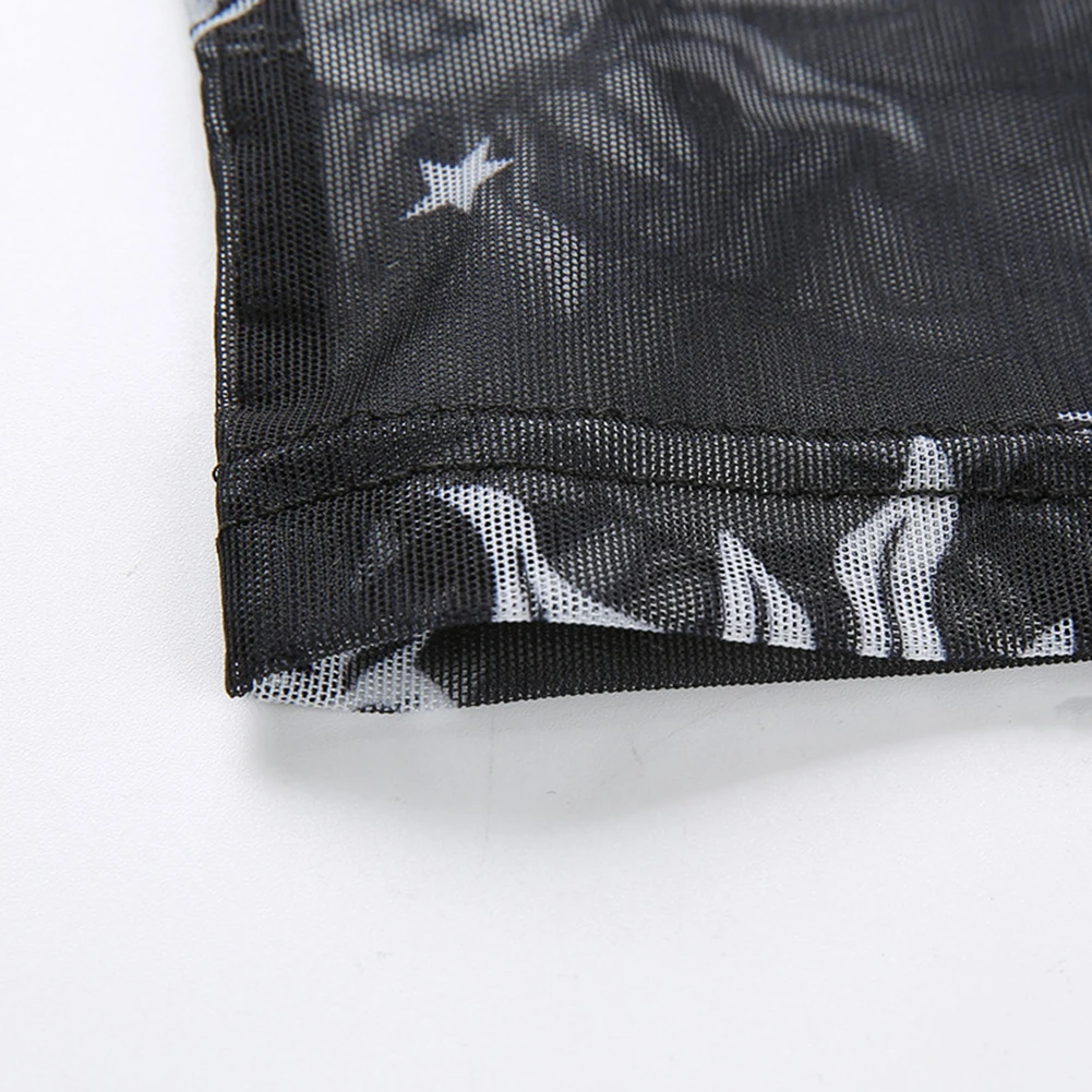 Женская мода о-образный вырез луна звезды печать сетка прозрачные укороченные женские топы Повседневная футболка с длинным рукавом черный