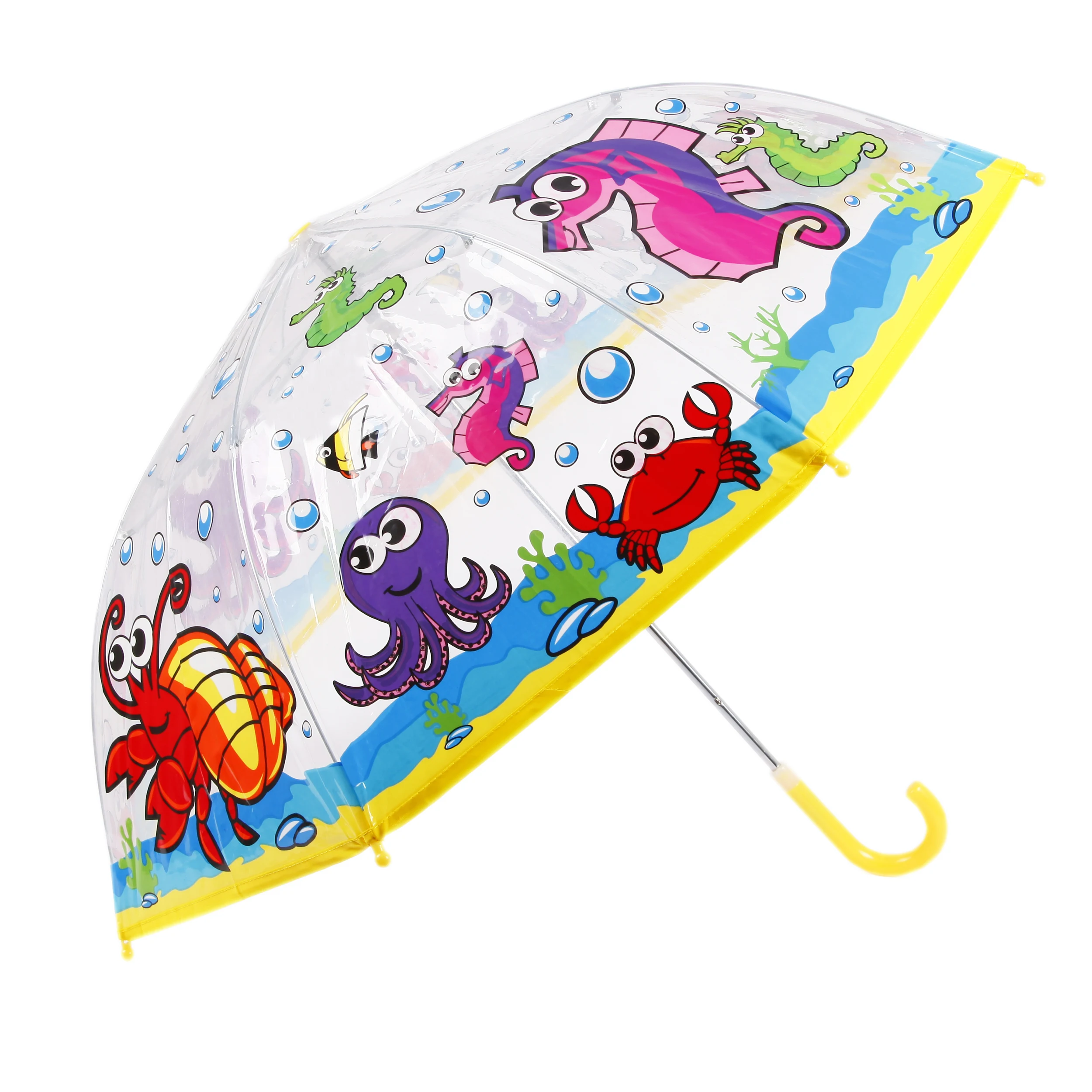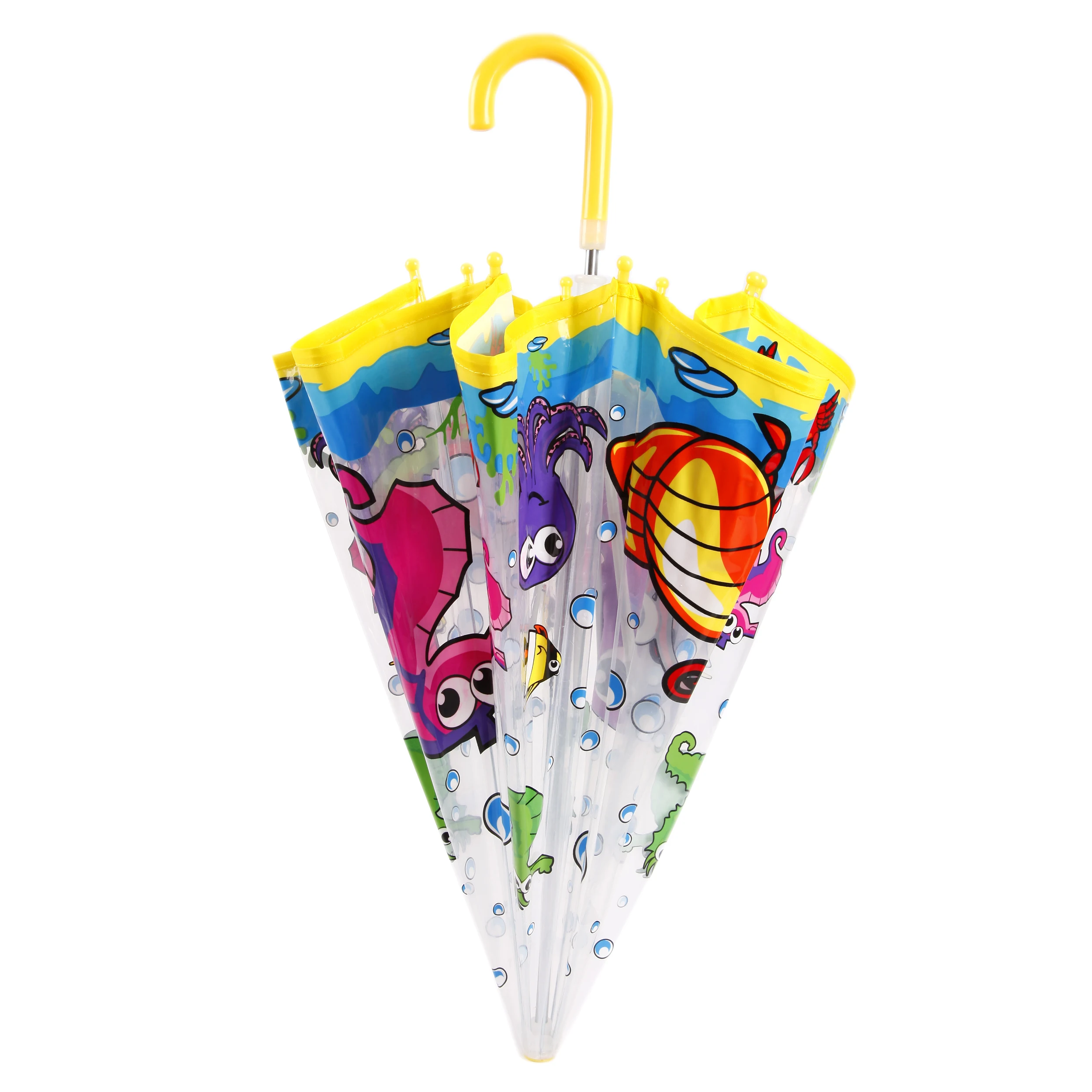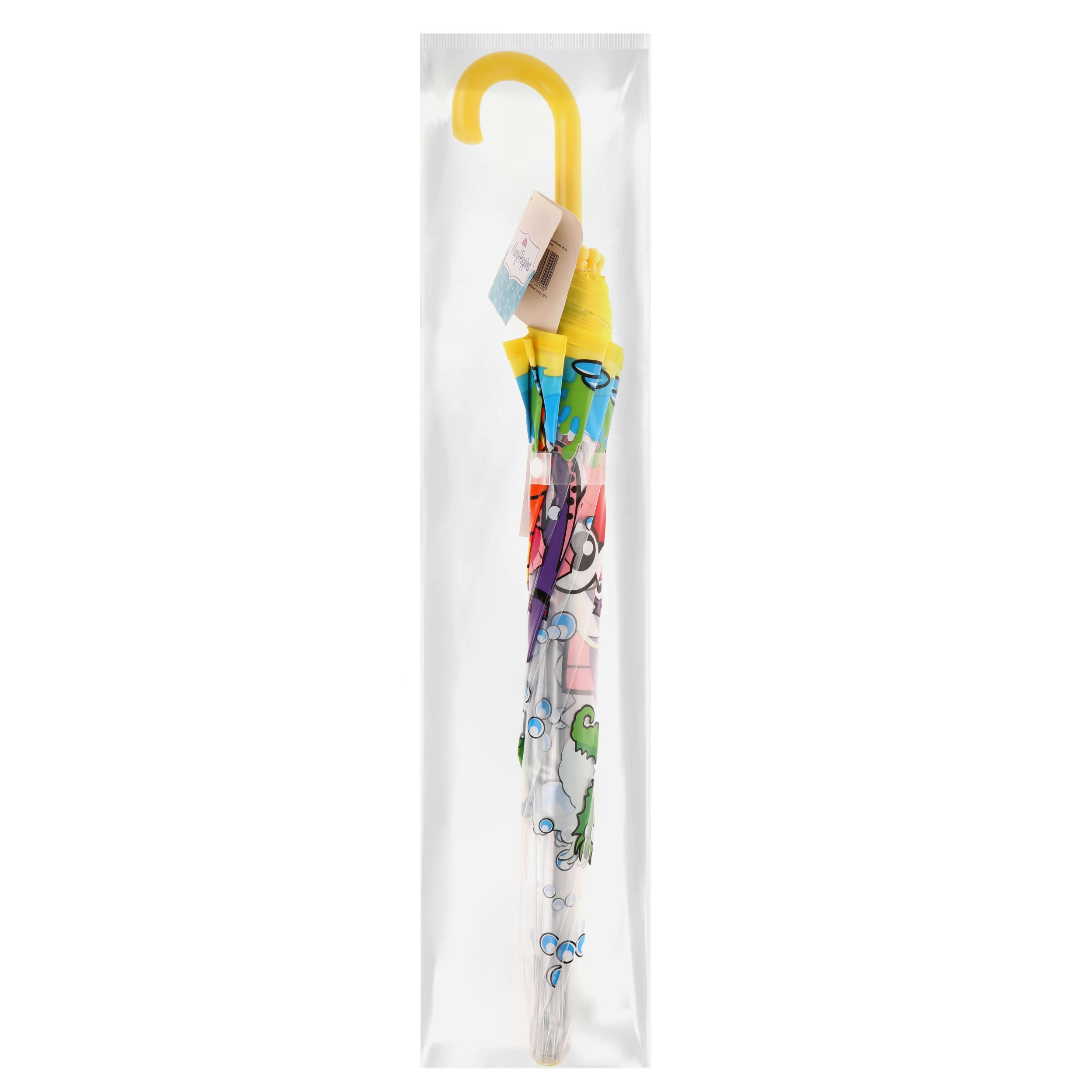 Детский зонтик-тросточка с забавным принтом защитит ребенка от непогоды. Зонтик не боится дождя и ветра благодаря прочному креплению купола к каркасу.Технические характеристики:Механическая система складывания;Концы спиц закрыты пластиковыми шариками;Пластиковый фиксатор на стержне зонтика;Радиус купола - 46 см, длина ручки - 57 см.