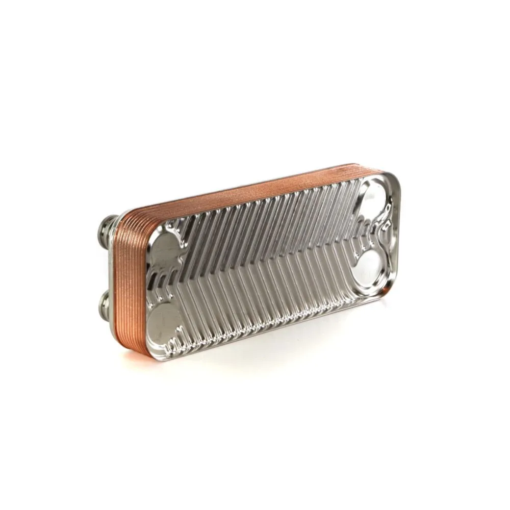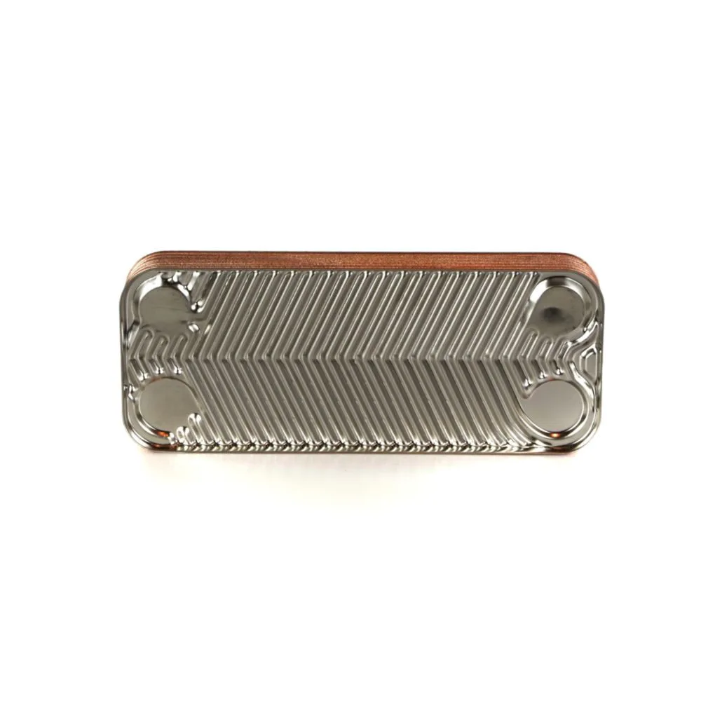 Пластинчатый теплообменник Zilmet 17B1901215 часто устанавливают в двухконтурных настенных котлах, т.к его предназначение это для нагрев горячей воды. Данная модель состоит из 12 пластин из нержавеющей стали марки AISI 304, спаянных между собой 99,9% медью. Площадь теплообмена каждой пластины составляет 0,012кв.м., имеет рабочую температуру от -10С до +120С и выдерживает давление до 8атм в контуре ГВС и до 3 атм в контуре отопления.