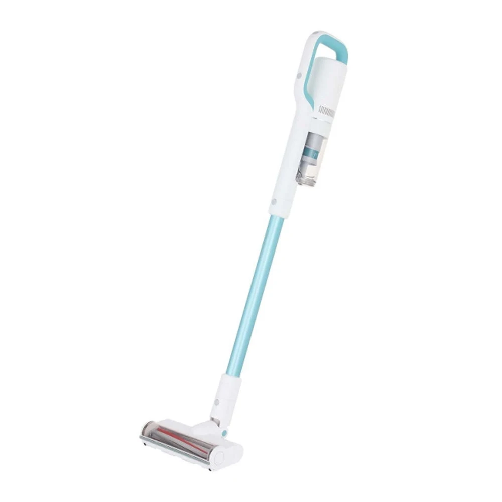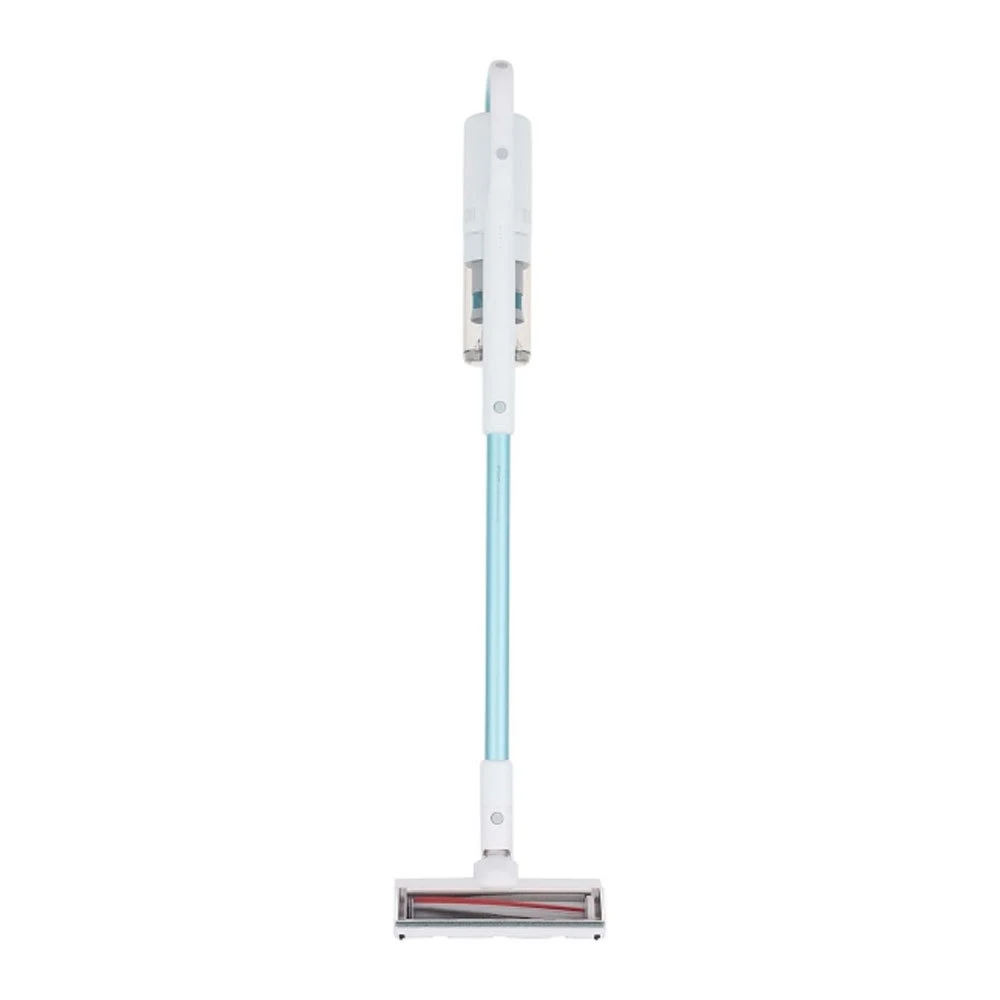 Беспроводной вертикальный пылесос, сухая уборка. Мощность всасывания 100вт. Потребляемая мощность 300вт. Циклонный фильтр HEPA. Тип управления электронный. Аккумулятор li-Ion Время рыботы 40 мин. Цвет белый/голубой.2 режима работы стандартный/турбо. 3 насадки в комплекте: турбо щетка, щелевая насадка, щетка.