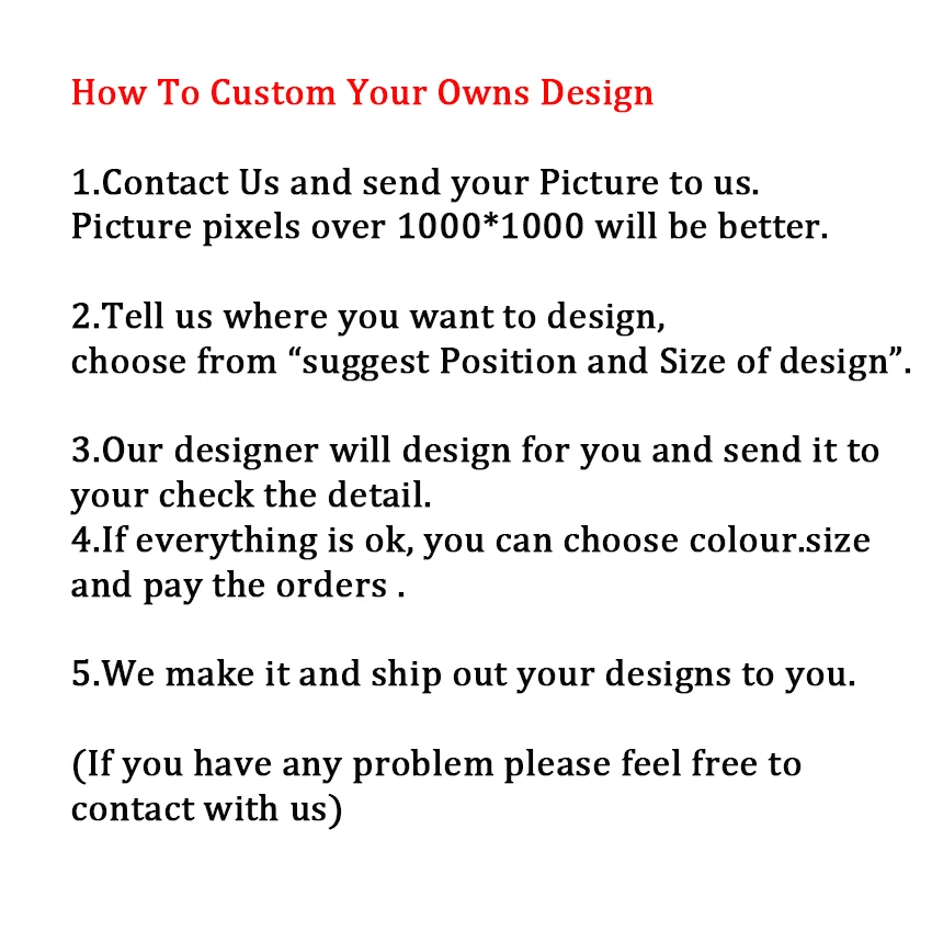 1. Свяжитесь с нами и отправьте нам свою фотографию. Изображение пикселей более 1000*1000 будет лучше.2. Сообщите нам, где вы хотите разработать дизайн, выберите «предлагаемое положение и размер дизайна».3. Наш дизайнер разработает для вас дизайн и отправит его вам, чтобы проверить детали.4. Если все в порядке, вы можете выбрать цвет. Размер и оплатить заказы.5. Мы изготавливаем и отправляем ваш дизайн.(Если у вас возникли проблемы, пожалуйста, свяжитесь с нами)