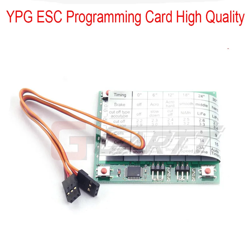 Это карта программирования для YPG ESCs. Эта карта позволит вам удобно программировать Ваши настройки ESC дома или в поле. Компактный размер позволяет хранить его в поле или кармане с легкостью. Варианты программирования: • Режим активной свободной обмотки цепи: Freew. off/Freew. on • Режим Govenor: Gov. off/Gov. store/Gov./fast Gov. • Регулятора режим P-коэффициент усиления антенны: 0,7/0,9/1,2/1,4/1,6/1,9 • Режим Govenor I-gain: 0,02/0,03/0,05/0,06/0,08/0,09 • Скорость запуска: Heli slow/Heli middle/Heli fast/Plane slow/Plane middle/Plane fast • Частота ШИМ: 8 кГц/9 кГц/10 кГц/12 кГц/14 кГц/16 кГц • Сила запуска: Авто 1 ~ 32%/2%/4%/8%/16%/32% • Время работы двигателя: 0 °/6 °/12 °/18 °/24 °/30 ° • Тормоз: off/Acro hard/smooth/middle/hard • Тип Отключения: выключение/замедление/отключение/NiMh/LiFe/LiPo • Напряжение отключения (жизненный режим): 2,2/2,3/2,4/2,5/2,6/2,7 • Критическое напряжение (режим LiPo): 2,9/3,0/3,1/3,2/3,3/3,4 • Ячейки: 4/5/6/7/8/9 • Ячейки: 10/11/12/13/14/15 • Специальные функции: звуковой сигнал короткий/Rev./стоп/полная скорость/F3A тормоз/Авто Синхронизация * Примечание: Эта карта программирования работает только с YPG ESCs