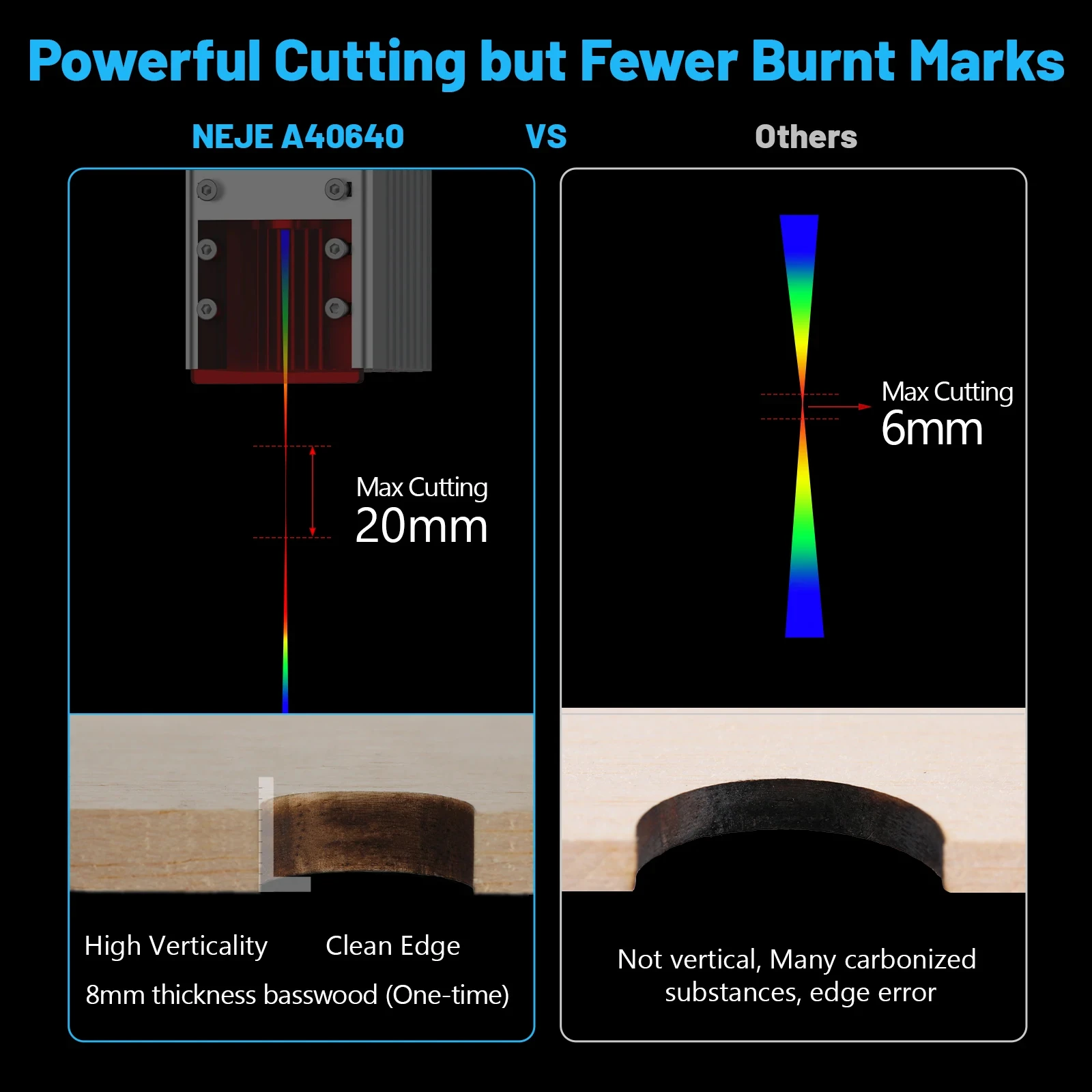 Максимальная глубина резки и резьбы: 18 мм(Данные тестируются пользователями NEJE, и они должны быть сделаны при более точной фокусировке и добавлении правильной и определенной силы воздушной помощи.)