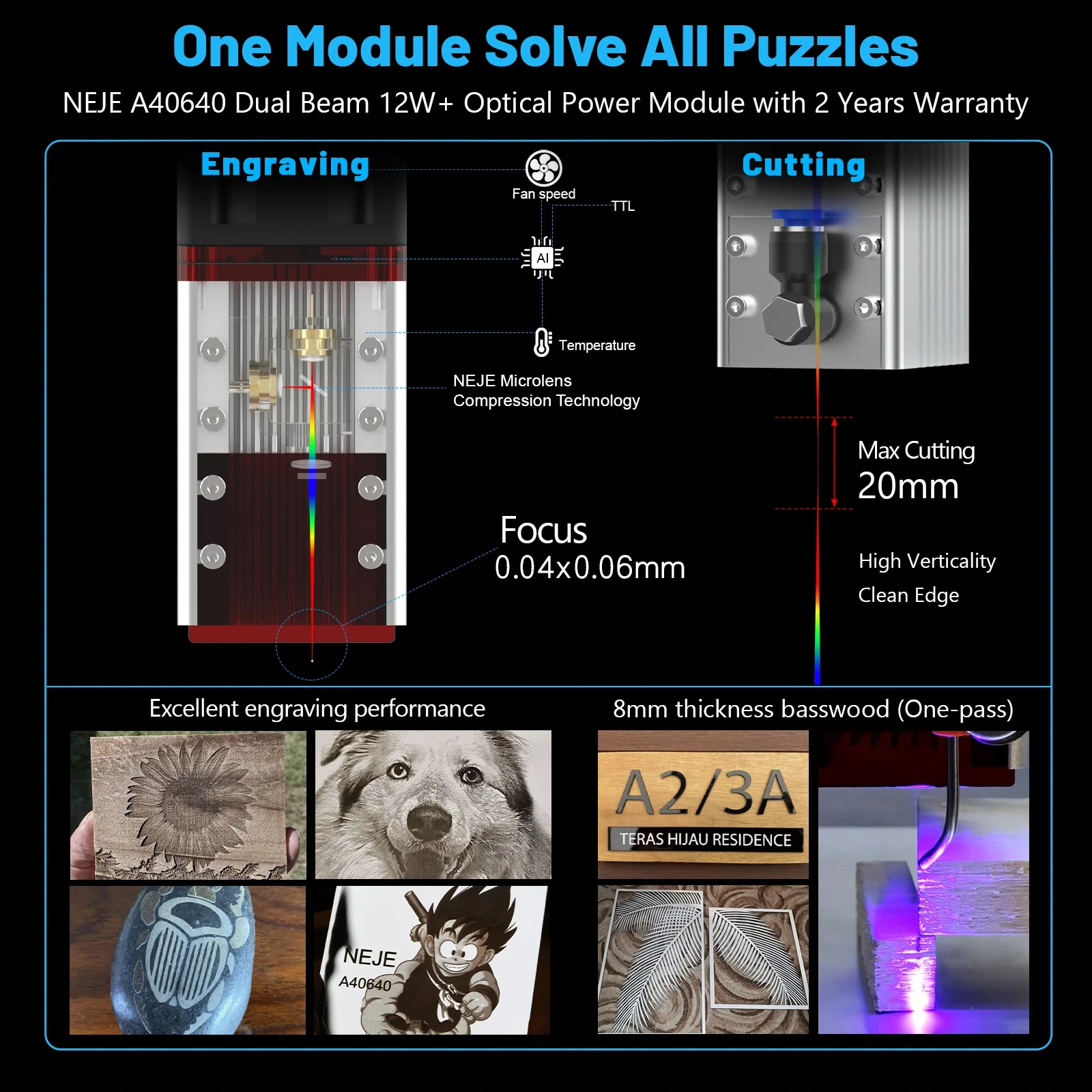 Модуль NEJE A40640 является эталоном для диодных лазеров. С момента выпуска A40640 в 2020 году, как Изобретатель первого в мире диодного лазерного модуля, его производительность не может быть превзойдена до сих пор. Зрелый и высокоэффективный дизайн оптической системы позволяет выходной мощности достигать 10 Вт-12 Вт, лазерный модуль NEJE A40640 имеет Минимальный фокус 0,04 мм и максимальную толщину резки 20 мм. В сочетании с NEJE automatic air assist, в многослойном режиме управления по lightburn, вы можете одновременно выполнять градацию серого, 3D, высококачественную резку и другие процессы. И угол резания меньше, режущая кромка более вертикальная и более чистая. Легкий дизайн 204g делает инерцию движения меньше и изображение более четким.