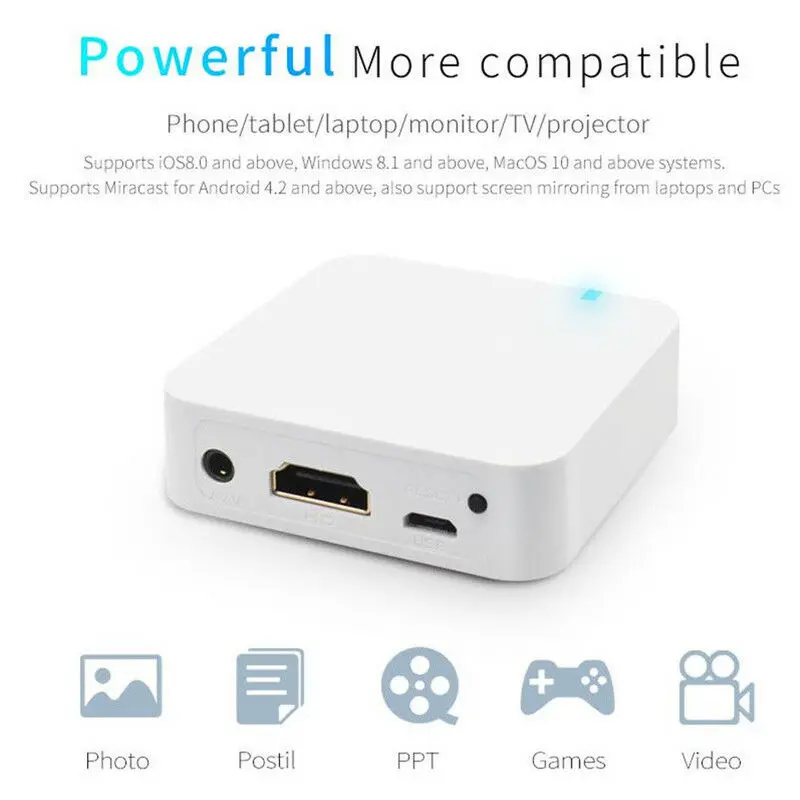 Поддержка Airplay, Miracast, Allsharecast, зеркального отображения экрана и DLNA. 720 / 1080P HD выход, наслаждайтесь хорошим качеством.