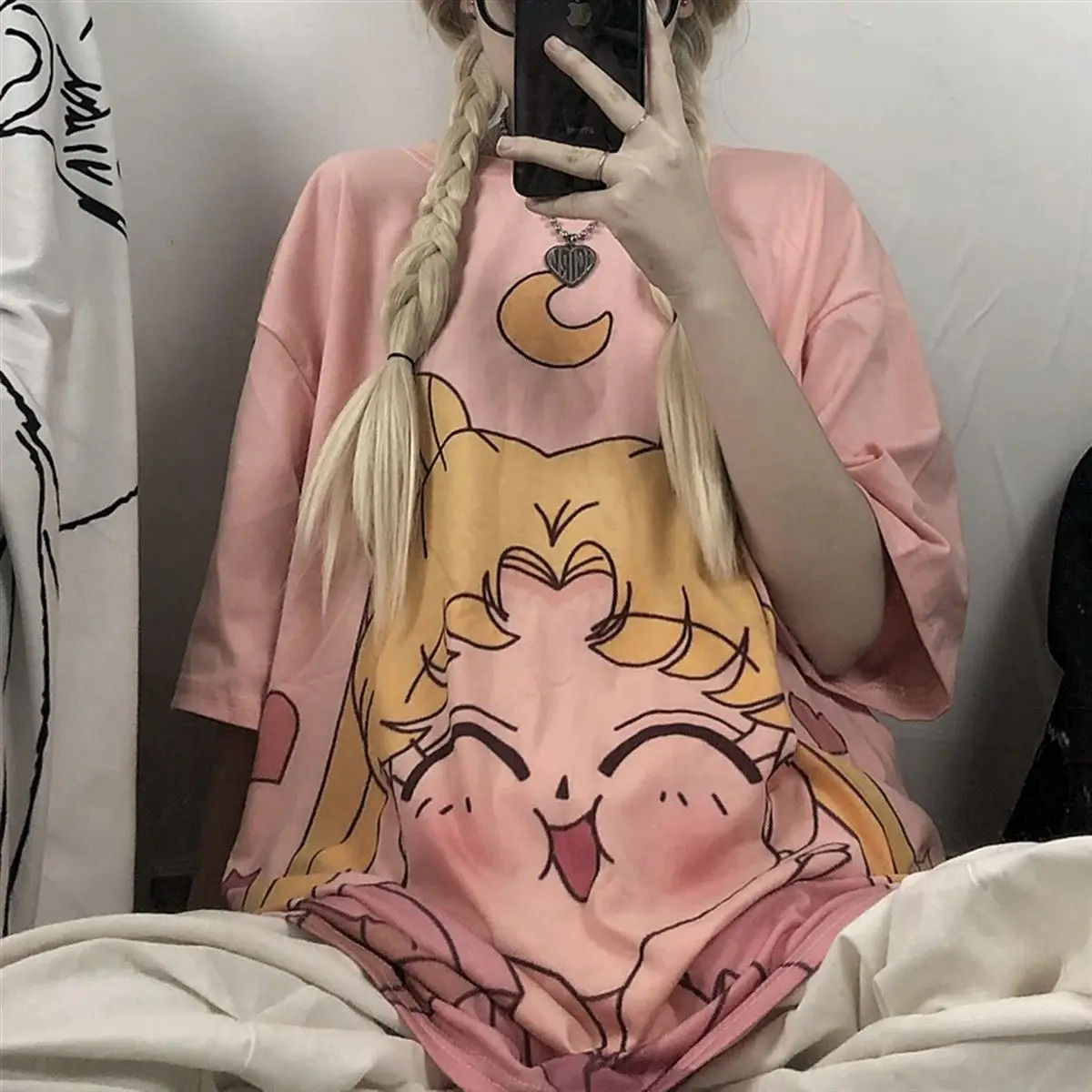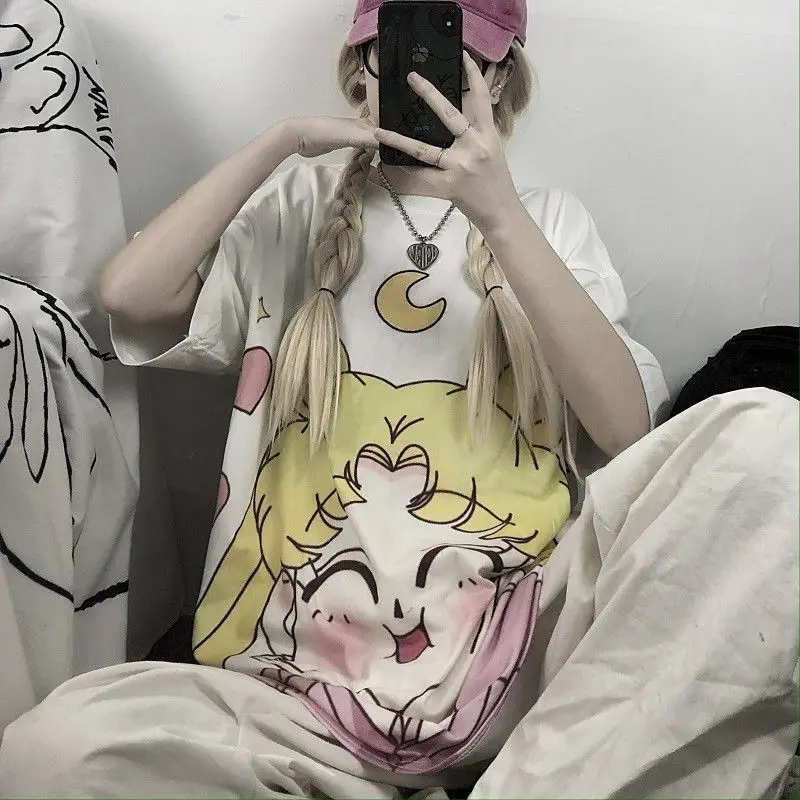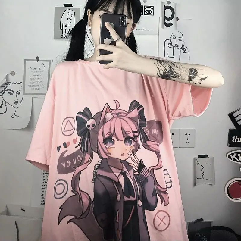 Милая мультяшная Милая футболка для девочек, Японская уличная одежда в стиле Харадзюку, Розовый Повседневный винтажный топ свободного женская летняя футболка в стиле Харадзюку