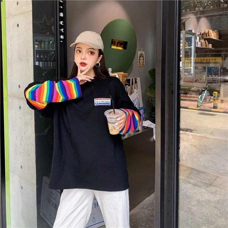 Женская футболка в радужную полоску с имитацией двух частей, повседневные свободные топы Harajuku BF, Женская корейская мода, новая уличная женская одежда