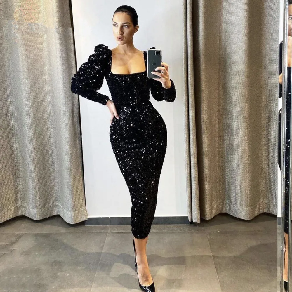 Женское блестящее вечернее платье-русалка, черное платье до середины икры с длинным рукавом и квадратным вырезом, официальное праздничное платье с блестками, 2022