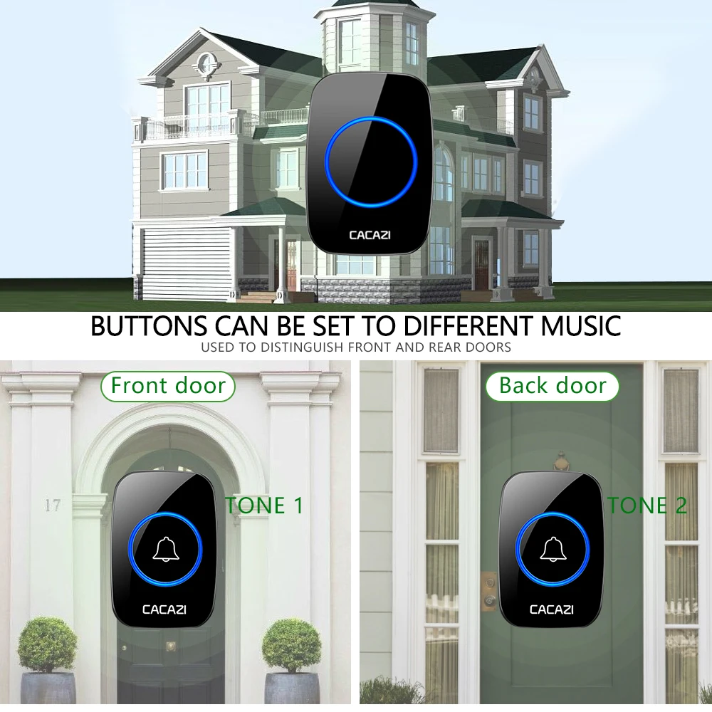 Беспроводной водонепроницаемый дверной звонок CACAZI, дистанция до 300 м, вилка стандарта США, ЕС, Великобритании, Австралии, интеллектуальный, с 1, 2 кнопками и 123 ресивером