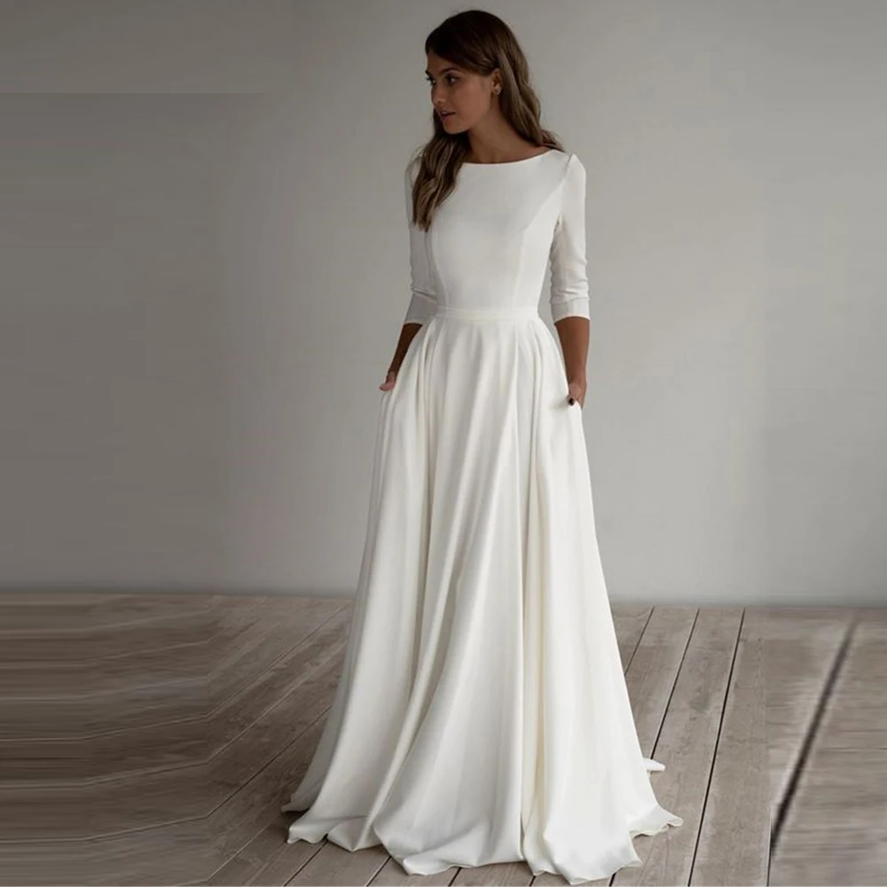 Простой сатин свадебное платье трапециевидной формы из крепа с длинными рукавами и вырезом лодочкой, изящные свадебные платья с карманами, размера плюс