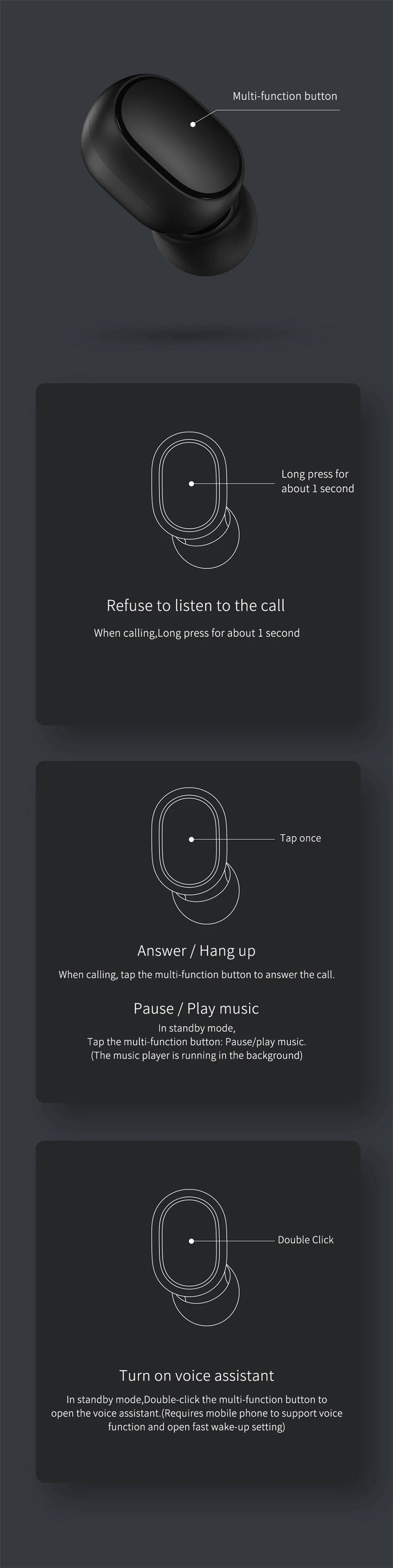 Новые оригинальные Xiaomi Redmi Airdots 2 True Беспроводные Bluetooth 5,0 TWS наушники гарнитура левый и правый режим низкого лага стерео Авто ссылка Примечание: 1. Версия CN: Red mi Airdots 2; Глобальная версия: Mi True Wireless Earbuds Basic 2 2. Redmi Airdots 2 по умолчанию не имеет зарядного кабеля. Обратите внимание, что коробка и usb-кабель не являются фирменными. Redmi AirDots 2 Настоящая Беспроводная bluetooth-гарнитура, bluetooth 5,0, автоматически подключается Быстрое подключение Автоматическое подключение секунд, можно использовать с наушниками 1 и 2 переключателя ---- (Новый) Один или два режима ушей бесшовный сдвиг. Bluetooth 5,0 Новое поколение технологии Bluetooth для более быстрых и стабильных соединений Светильник 4,1g Удобно носить, свободно регулируется, не легко отпадает 12h длительный срок службы батареи С зарядным боксом, кистью 6 фильмов Голосовое управление Summon голосовой помощник, голосовое управление мобильный телефон Примечание 1. При покупке bluetooth-наушников, пожалуйста, прочитайте следующие инструкции: Из-за длительной транспортировки мощность наушников будет истощена. Вы не сможете использовать наушники, когда получите посылка. Он может быть выключен. Первое, что нужно сделать, это зарядить коробку для наушников в течение 30 минут. Очень важно. Спасибо! 2. В оригинальной посылка отсутствует зарядный кабель, вы можете купить, если вам это нужно! Обратите внимание! О дропшиппинг: 1. Принимаем дропшиппинг, и мы не будем размещать счета-фактуры, qr-коды, рекламные акции в доставке, так что не волнуйтесь, просто купите его, мы сделаем все для вас хорошо. 2. Мы гарантируем, что каждое устройство тщательно проверяется перед отправкой, поэтому все продукты могут гарантировать 100% Высокое качество перед отправкой. 3. И если вам нужно отправить быстро, пожалуйста, свяжитесь с нами, мы можем организовать приоритетную доставку. Большое спасибо! Если у вас есть какие-либо проблемы, пожалуйста, свяжитесь с нами, мы ответим как можно скорее. После продажи Если количество обнаружено несовместимым с количеством после получения экспресс-доставки или проблемы с качеством, пожалуйста, не открывайте споры по желанию, И свяжитесь с нашим послепродажным обслуживанием клиентов, чтобы решить вовремя, спасибо за вашу поддержку и понимание! Описание: Модель: TWSEJ06LS Версия: версия CN Цвет: черный Размер: 26,65 × 16,4 × 21,6 мм (наушники)/62 × 40 × 27,2 мм (чехол) Вес: 4,1 г (каждого наушника)/35,4 г (всего) Bluetooth: Bluetooth 5,0 HFP/A2DP/ HSP/AVRCP Водонепроницаемость: IPX4 Аккумулятор: 40 мАч (каждый наушник)/300 мАч (чехол) Время зарядки: 90 мин (наушники)/120 мин (чехол) Расстояние подключения: 10 м Первая пара 1. Выньте два наушника и он включится автоматически. 2. Обновите bluetooth-устройство телефона и нажмите Redmi Airdots S для подключения. * Поместите наушники обратно в зарядную коробку, светильник для наушников красного цвета, затем отсоедините автоматически, выньте наушники и светильник белого цвета, затем автоматически Подключите обратно. Как сбросить гарнитуру 1. Удерживайте многофункциональную клавишу в течение 15 секунд, пока красные и белые огни не мигают поочередно 3 раза и не выйдут, устройство успешно сбрасывается; 2. Игнорируйте или удаляйте Redmi AirDots S в списке устройств Bluetooth телефона, удалите запись подключения и завершите сброс.