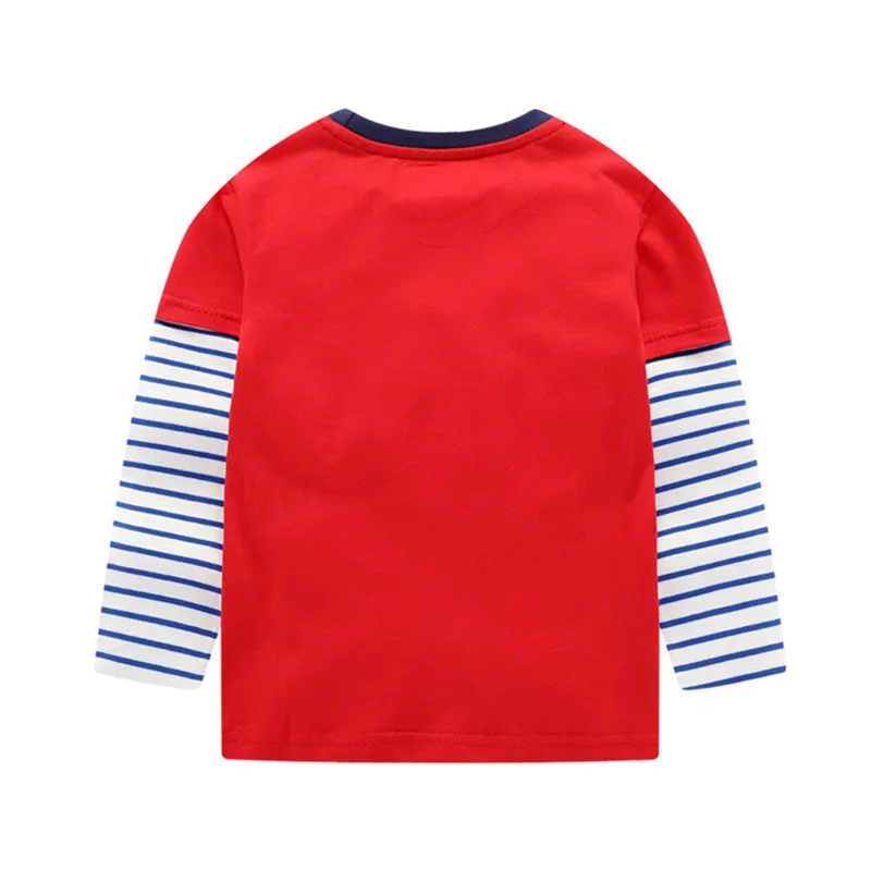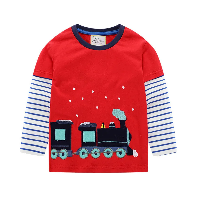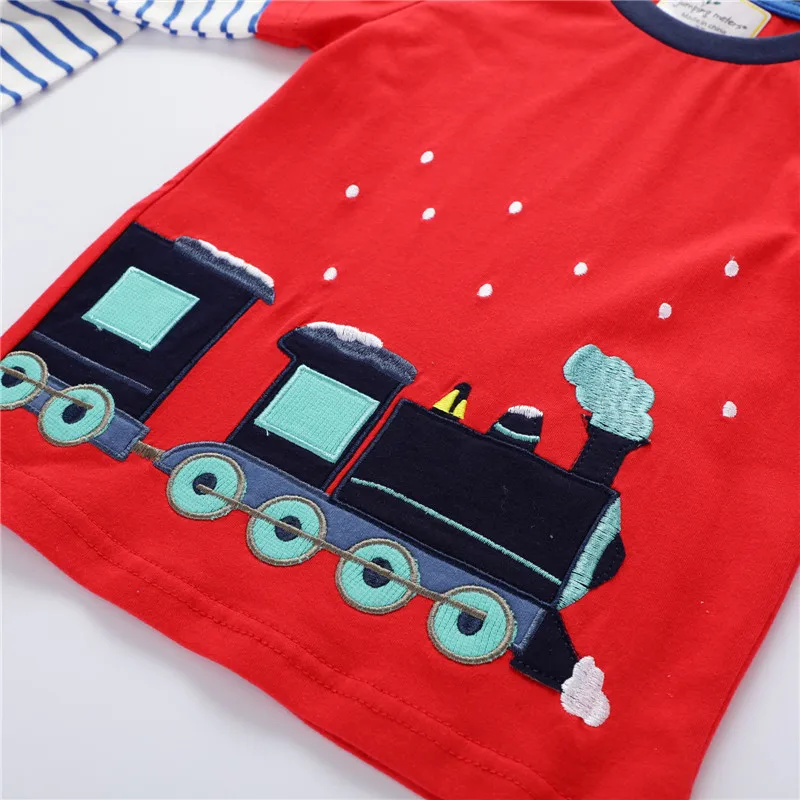Прыжки метров, Новые осенне-весенние красные детские футболки с длинными рукавами для детей, хлопковые футболки с аппликацией поезд модные детские топы