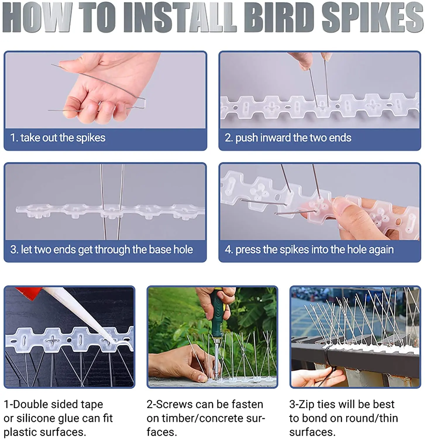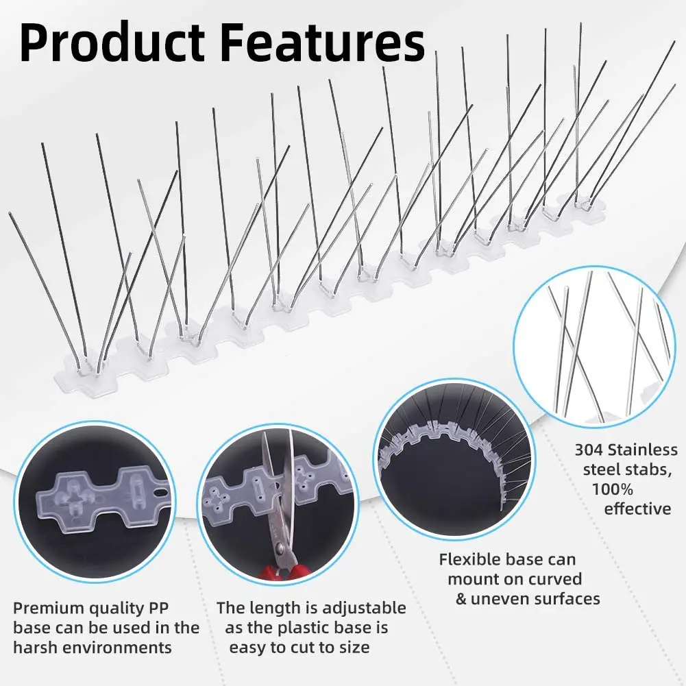 Описание1. Анти-птичьи шипы являются экономичными, практичными, могут предотвратить птиц от продукта, характеризуется безопасностью, эффективностью, защитой окружающей среды, украшением окружающей среды, простотой в обслуживании, долгим сроком службы.2. Предохранение от птичьих шипов применимо к зданиям, фабрикам продуктов питания, фармацевтическим фабрикам, отелям и ресторанам, которые нуждаются в защите. Он может быть установлен на верхней части стен, карнизов, подоконников, балконов, перил, уличных ламп и других мест, где птицы могут отдыхать.3. Использование высококачественного пластика и нержавеющей стали, срок службы более 10 лет.