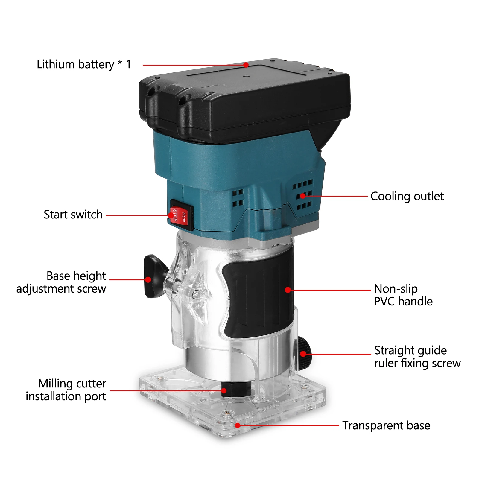 Характеристики:Материал: медь, алюминийВходная мощность: 800 ВтСкорость без нагрузки: об/минЧастота: 50 ГцАксессуары: черный или белый случайный цветДиаметр цанги: 6,35 мм (1/4 дюйма)Длина кабеля питания: 1,5 мРазмер изделия: 200*86*78 мм/7,9*3,4 * дюймаВес изделия: 1800 г/фунтаПосылка: 230*130*110 мм/9,1*5,1 * 4.3inВес посылка: 1750 г/фунтаУпаковочный лист:1 * Деревянный электрический триммер2 * гаечные ключи1 * направляющая для триммера в сборе1 * Прямая направляющая в сборе1 * Руководство пользователя