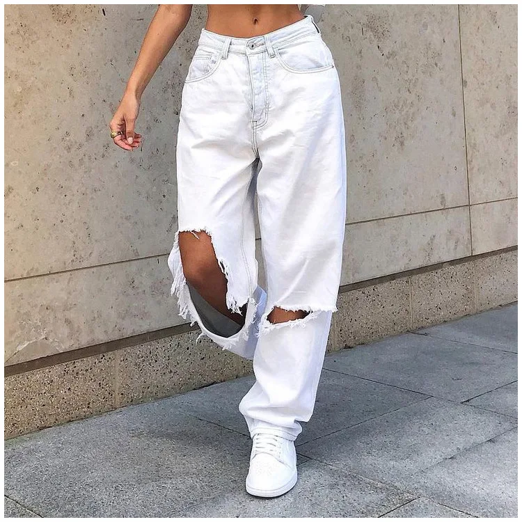 Женские джинсы с высокой талией, большие рваные белые женские джинс...