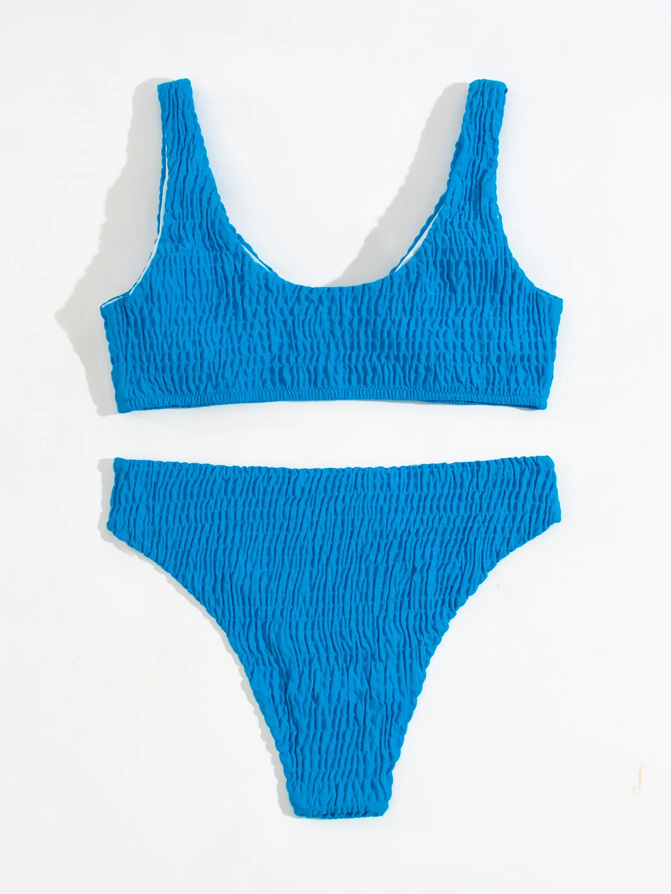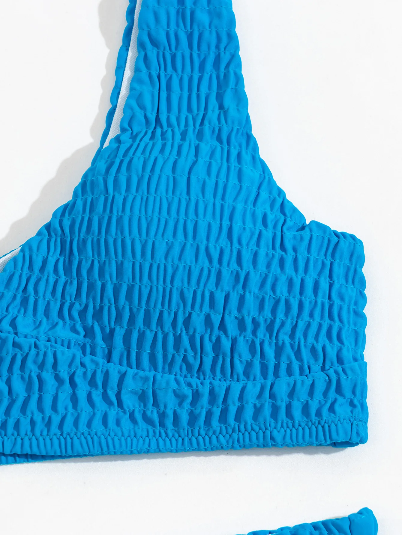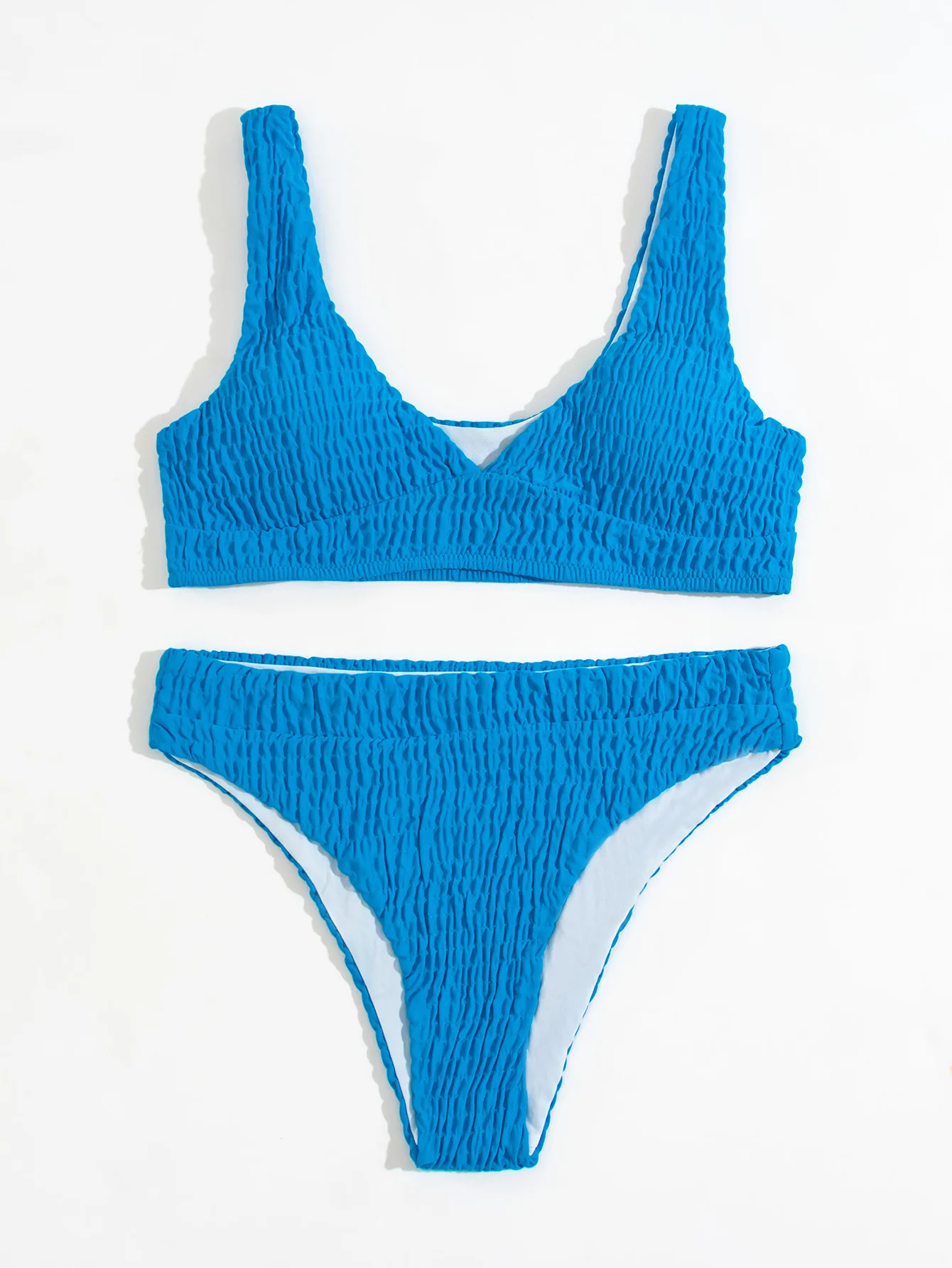 Женские Плиссированные бикини, комплект из 2 предметов, однотонные синие купальные костюмы с высокой талией, топы и трусики, купальники, бикини, Монокини пуш-ап