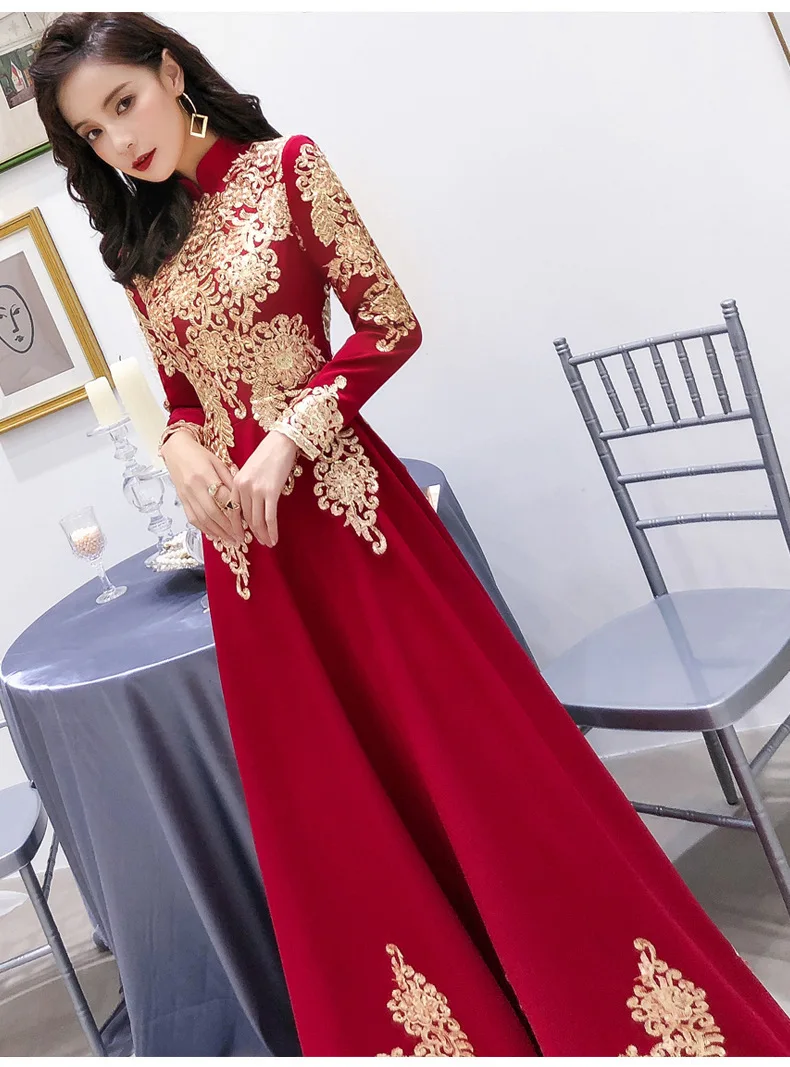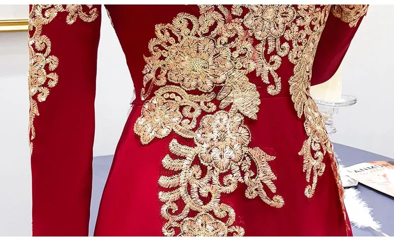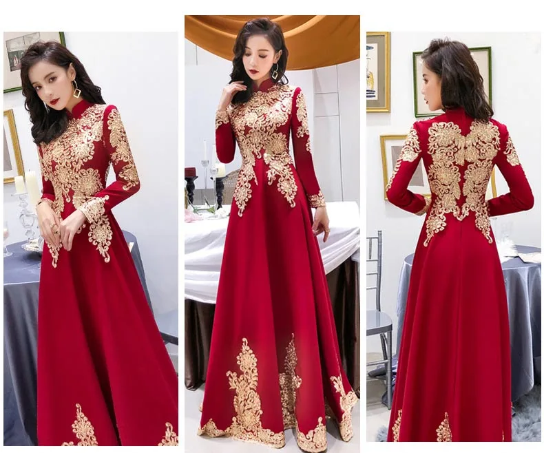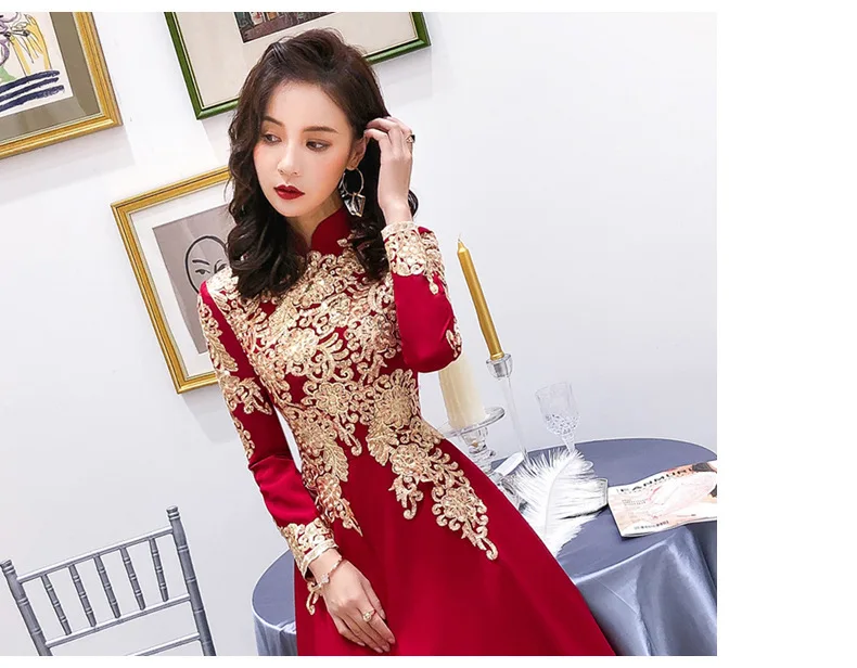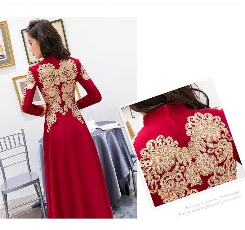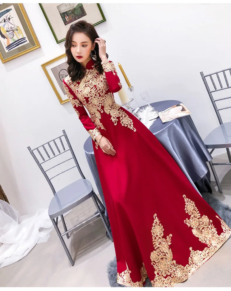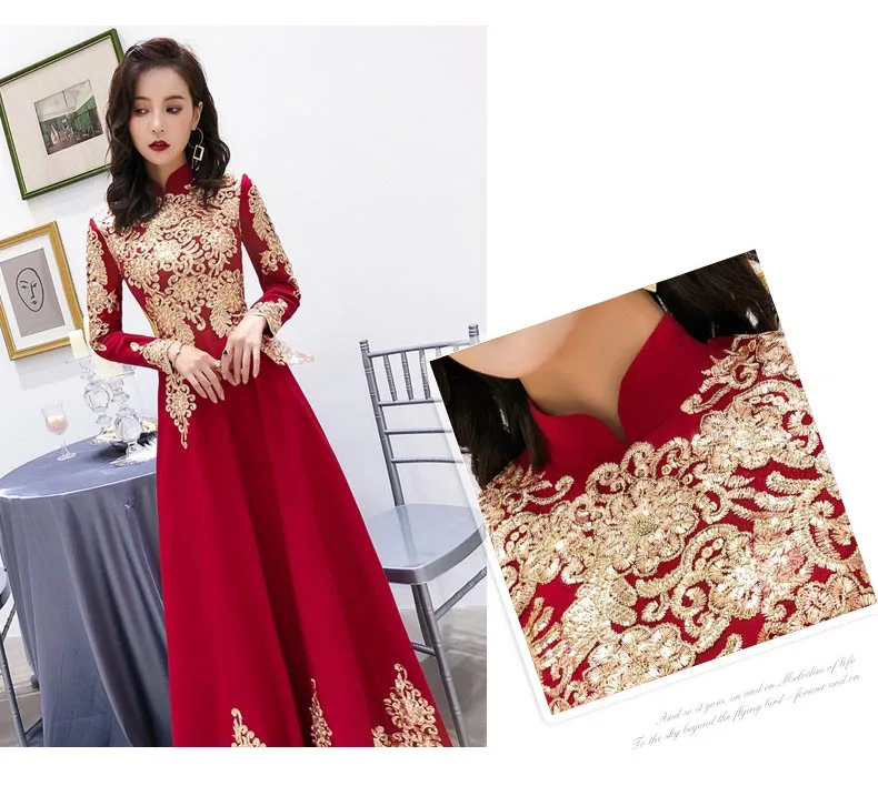 Винтажное красное свадебное платье Ципао для невесты роскошное вечернее платье с вышивкой элегантное женское Платье трапециевидного силуэта с длинным рукавом Женские вечерние платья
