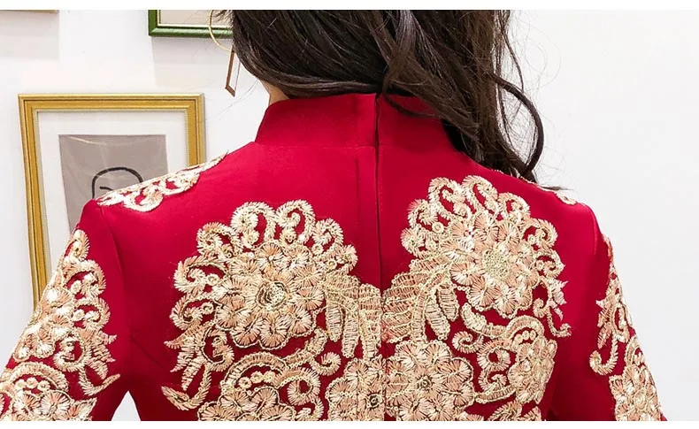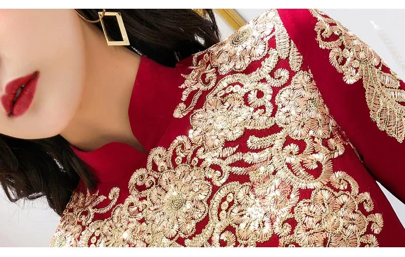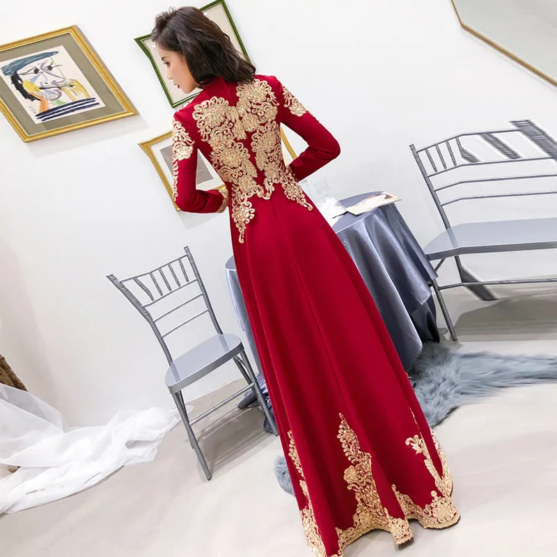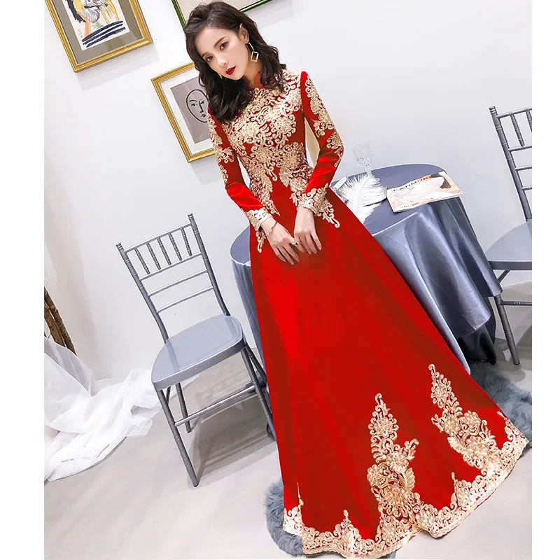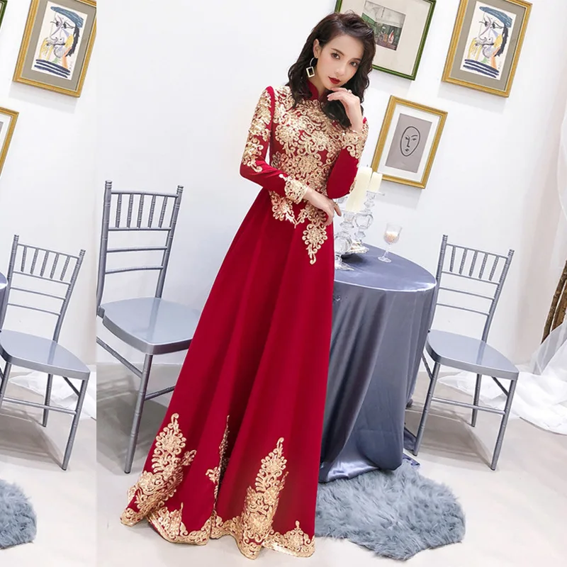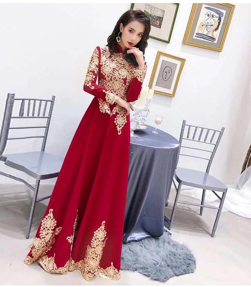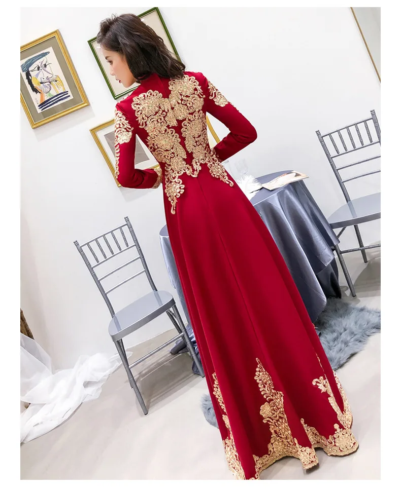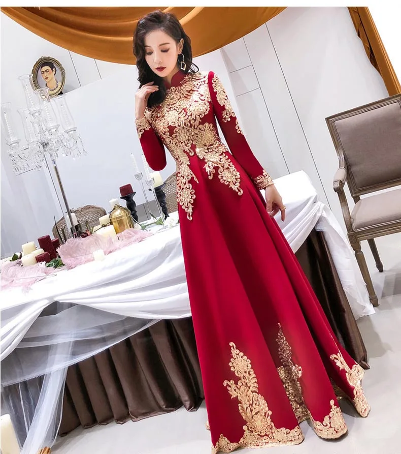 Винтажное красное свадебное платье Ципао для невесты роскошное вечернее платье с вышивкой элегантное женское Платье трапециевидного силуэта с длинным рукавом Женские вечерние платья