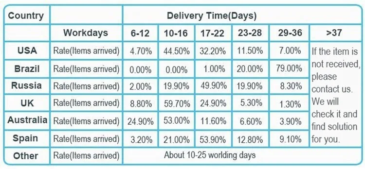 Все товары будут доставлены в течение 3-5 рабочих дней. Авиапочтой: 15-20 дней в Азию, Европу, Северную Америку DHL, UPS, FedEx: 3-5 рабочих дней в большинство стран