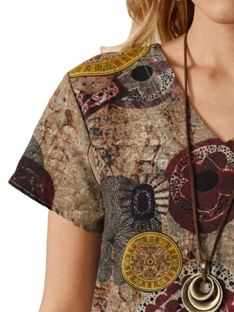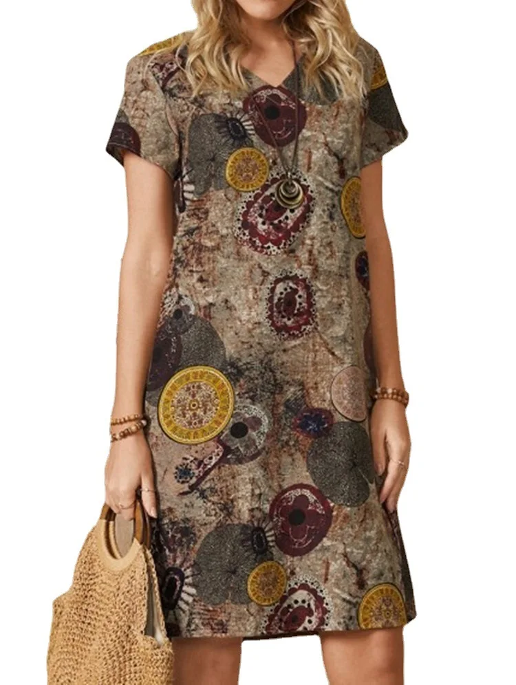 Платье женское хлопково-льняное с V-образным вырезом и коротким рук...