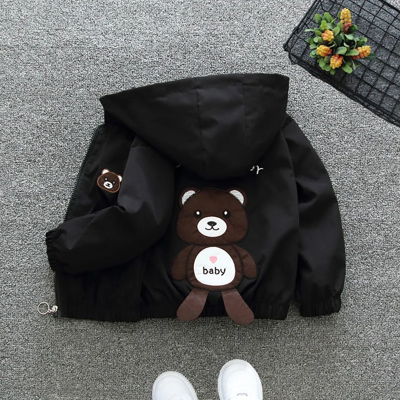 Куртка для маленьких мальчиков, с изображением медведя из мультфильма, Весна пальто на молнии с капюшоном, Ветровка для девочек, осенняя верхняя одежда, детская одежда От 1 до 6 лет