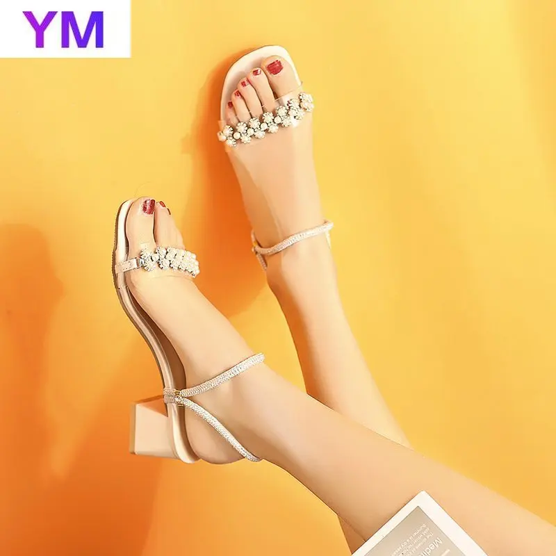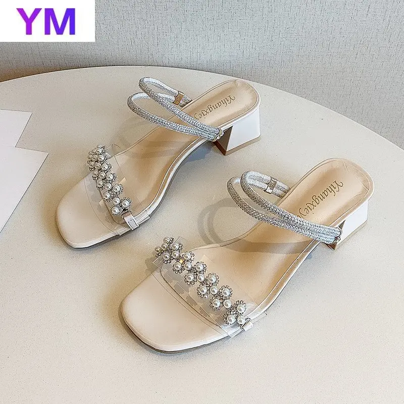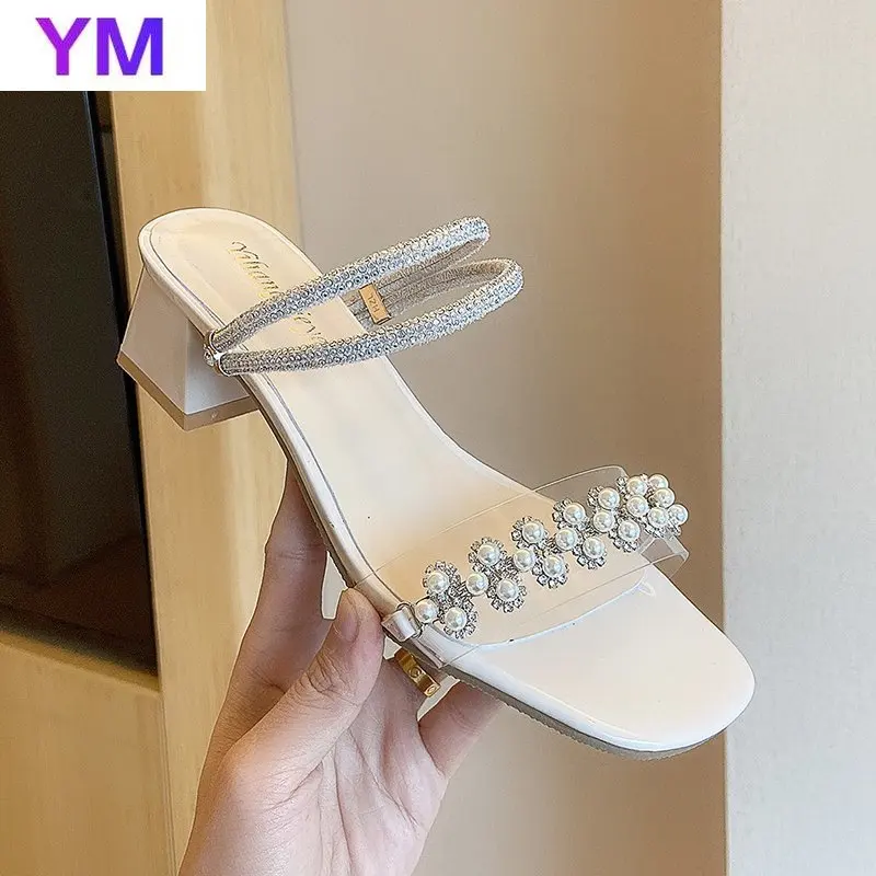 Сандалии женские на прозрачном каблуке, пляжные шлепанцы с жемчугом...