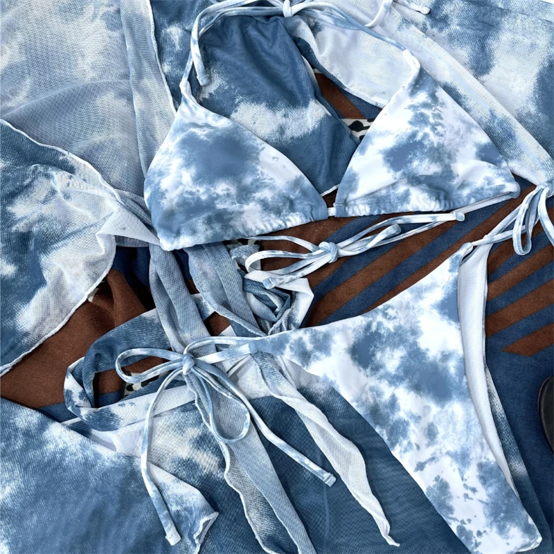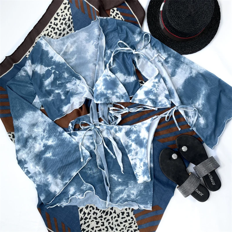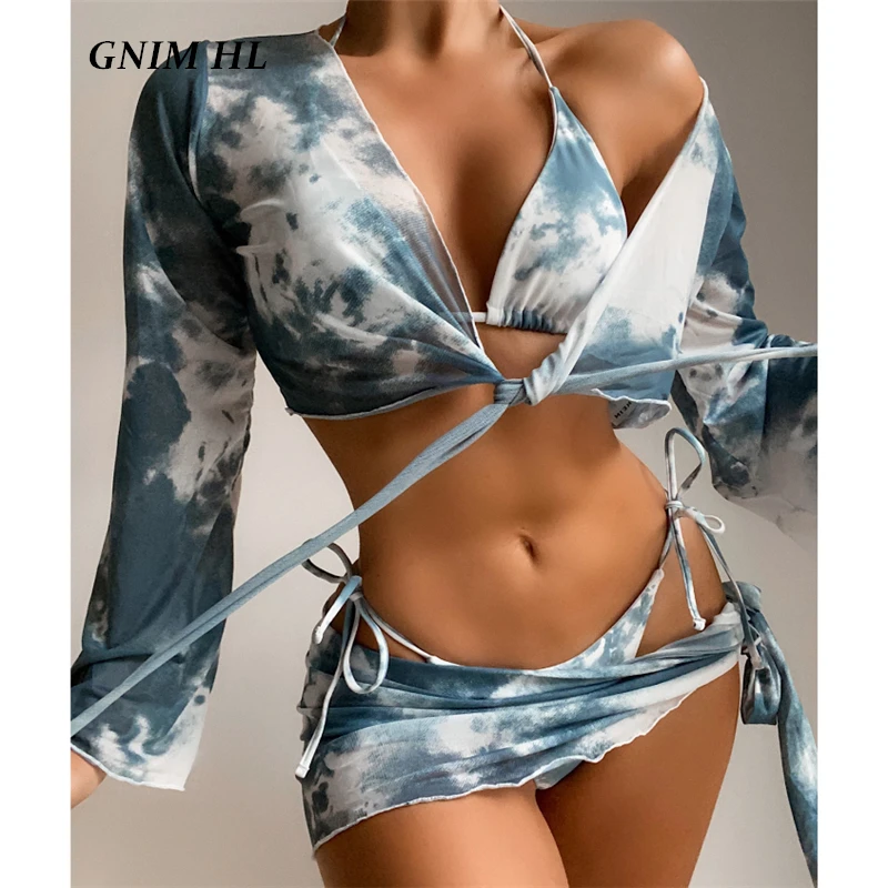 Женский треугольный купальник GNIM, пикантный комплект бикини с принтом тай-дай, одежда для плавания из четырех предметов, пляжная одежда для купания, лето 2021