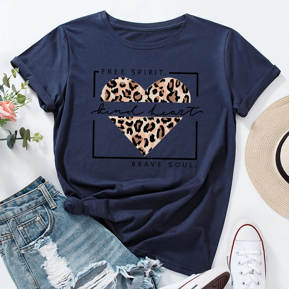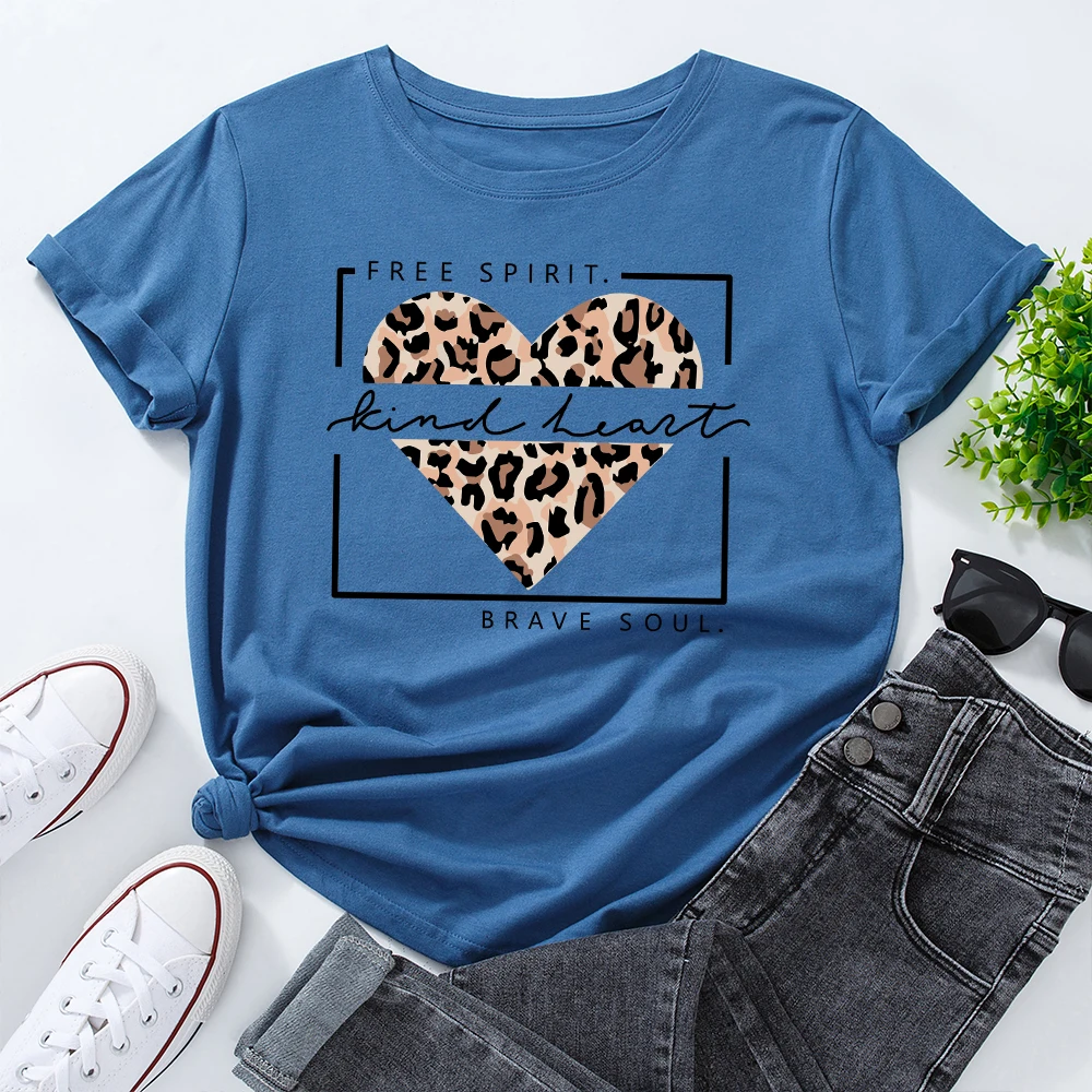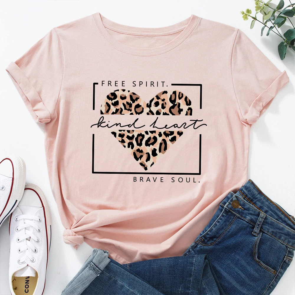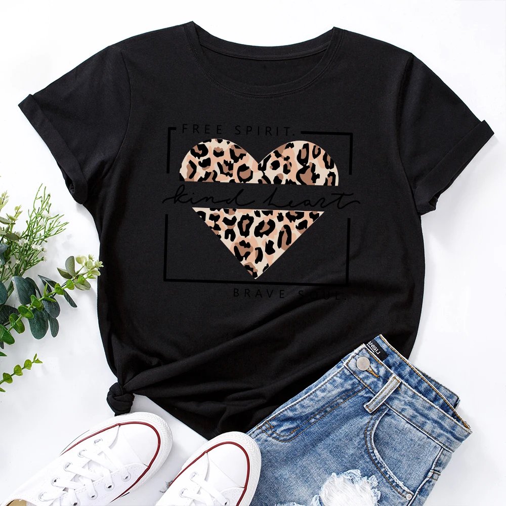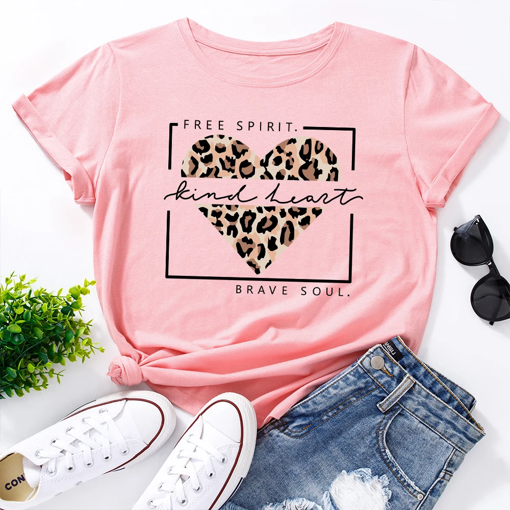 Футболка женская с леопардовым принтом, смешная с надписью Love Heart Free, с рисунком духа храбрости, летний топ с коротким рукавом