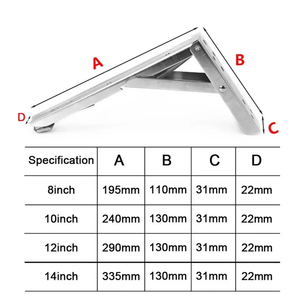 Характеристики:Материал: нержавеющая стальЦвет: серебристыйРазмер: 8 дюймов/10 дюймов/12 дюймов/14 дюймов8 дюймов: 195*110 мм10 дюймов: 240*130 мм12 дюймов: 290*130 мм14 дюймов: 335*130 ммКоличество: 2 шт.Посылка: 2 x треугольный складной кронштейн с винтамиХарактеристика:Экономия пространства: Сложите кронштейн, нажав на ручку на длинной руке; Подходит для ограниченного пространства.Прочная и стабильная: треугольная структура является самой прочной конструкцией в настенных кронштейнах в настоящее время.Широкое использование: может быть установлен в вашем гараже, кухне, мебели, ванной комнате, спальне и в других местах.【Теплое напоминание 】Установка должна быть ровной и винты установлены на месте, чтобы избежать ослабления.Если складывающиеся скобы издают звуки помола, когда они открываются и закрываются, вы можете положить на них немного силиконовой смазки, которая успокоится.Примечания:1. Пожалуйста, учитывайте разницу в 1-3 мм из-за ручного измерения, спасибо за понимание!2. Из-за разницы между различными мониторами, пожалуйста, поймите, что изображение может не отражать фактический цвет товара.