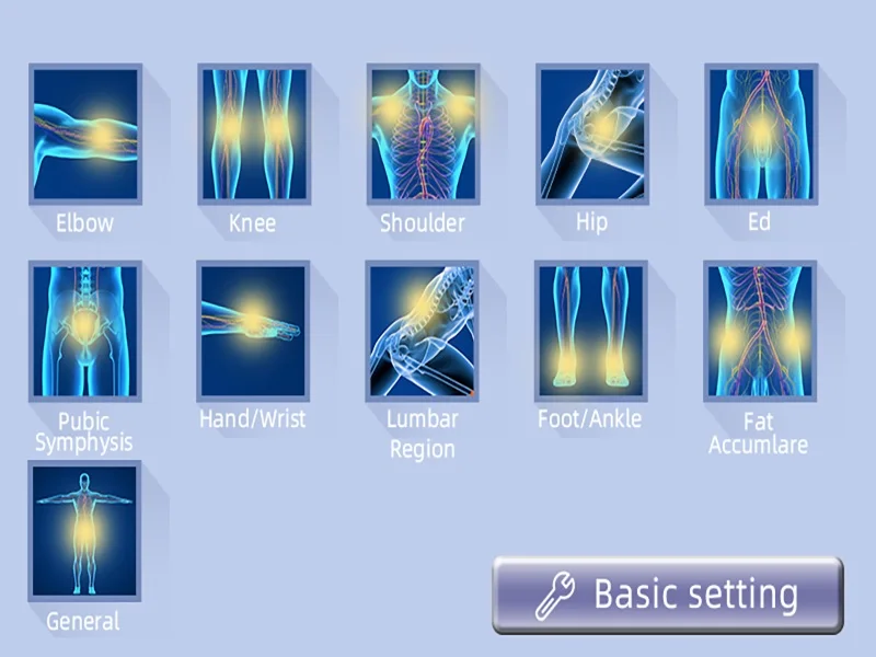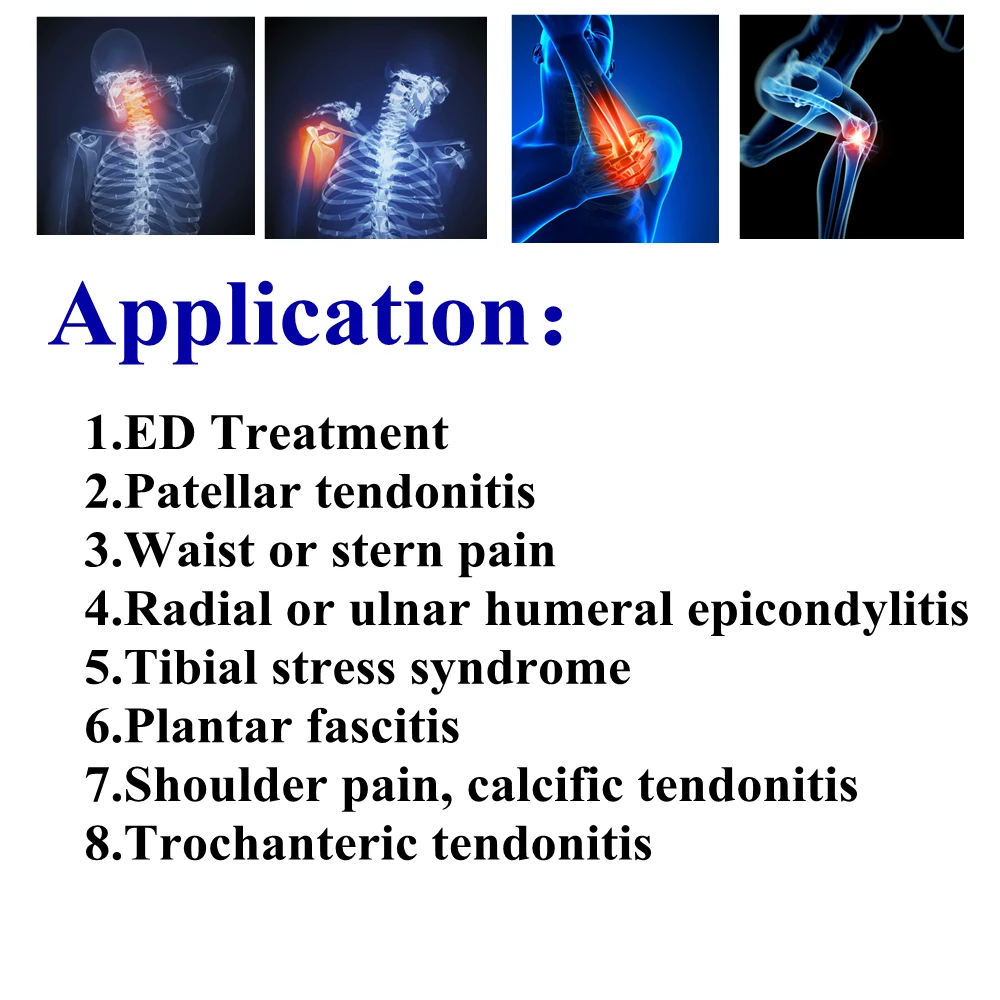 1. Лечение ED2. Пателлар тендонит3. Боль в талии или в суровой области4. Радиальный или ulnar humeral эпикондилит5. Синдром тибиального стресса6. Подошвенный Фасцит7. Боль в плечах, кальцифический тендонит8. Троchanteric tendonitis