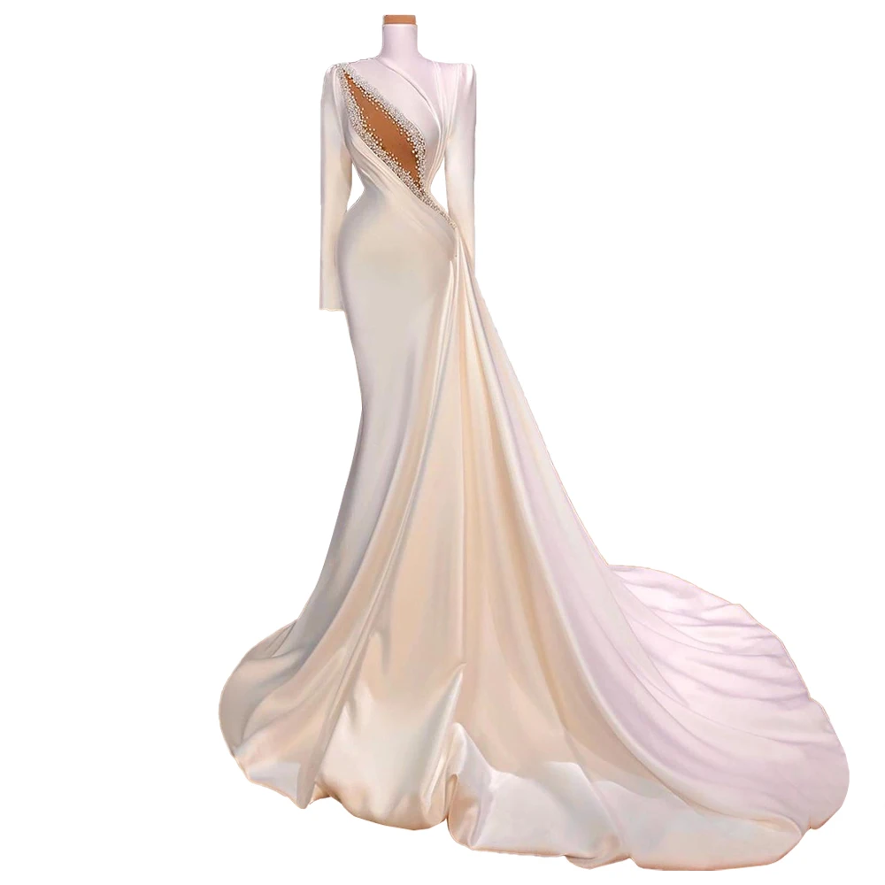 Элегантные белые вечерние платья с круглым вырезом, длинными рукава...