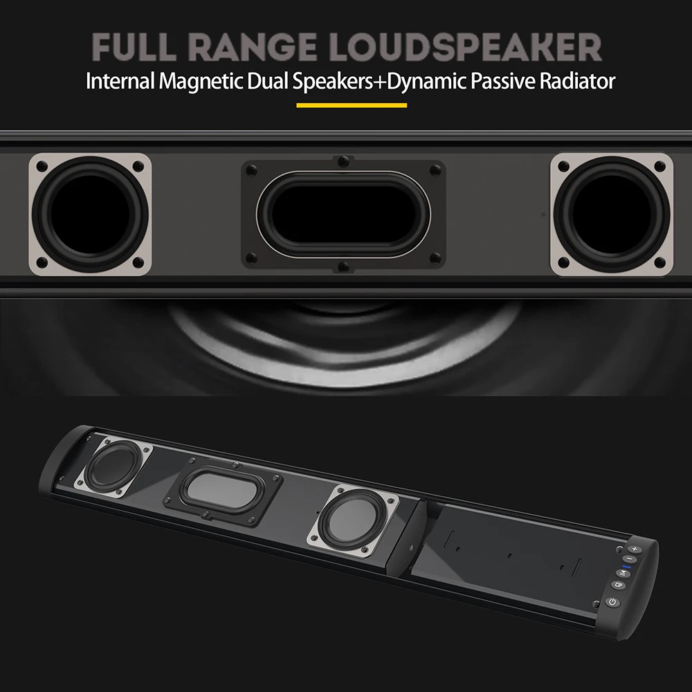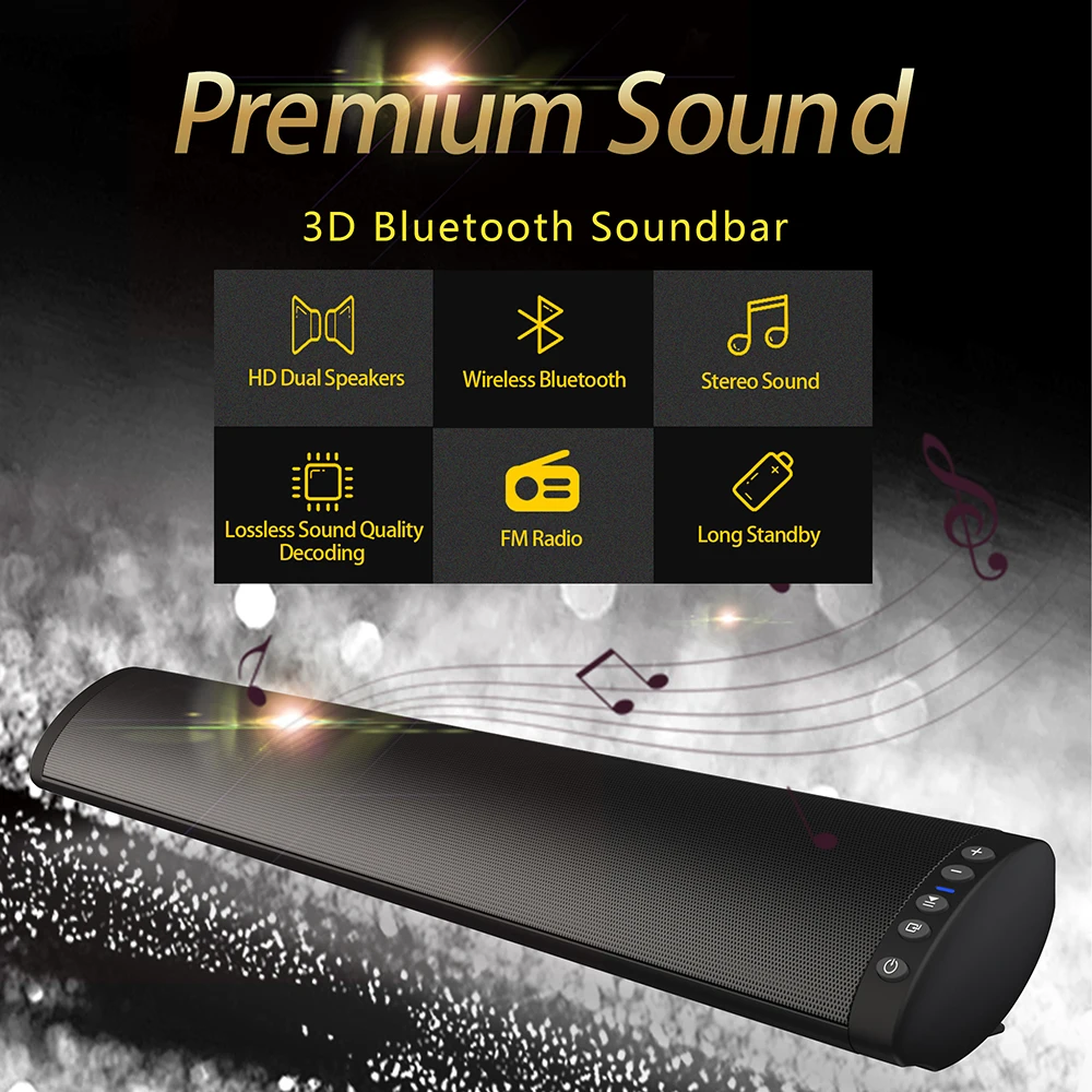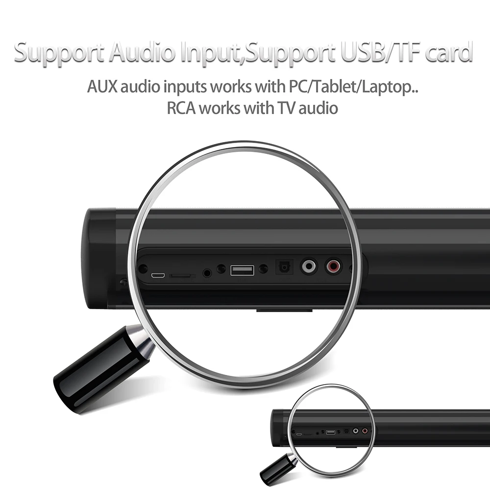 Канал: 2,01. Версия Bluetooth: 5,02. Динамик: 10 Вт * 23. Расстояние Bluetooth: 10 м4. Емкость аккумулятора: 2000ма 7,4 В5. Номинальное напряжение: DC 5V6. Время воспроизведения музыки: около 6 часов.7. Время в режиме ожидания: 240 часов.8. Время зарядки 1А: около 3 часов.9. Аудиовход:Bluetooth,RCA,AUX,TFКарта, оптический, USB10. Размеры: 540x58x78,5 мм/21,26 дюйма x 2,28 дюйма x 3,09 дюйма11. Вес нетто: 780 г12.FM Радио Частота: 87,5-10813. Аксессуары: кабель для зарядки, RCAКабель, AUX кабель, оптический кабель,Пульт дистанционного управления, инструкция14. ПоддержкаТВ/ПК/телефон/планшет/ноутбук/MP3/MP4/DVD-плеер/ТВ-приставка аудио