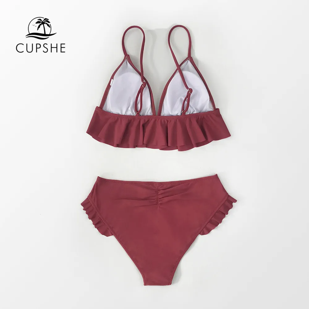 CUPSHE красный гофрированный комплект бикини со средней талией, купальник для женщин, сексуальный треугольный вырез, купальник из двух частей, новинка 2021, пляжные купальные костюмы