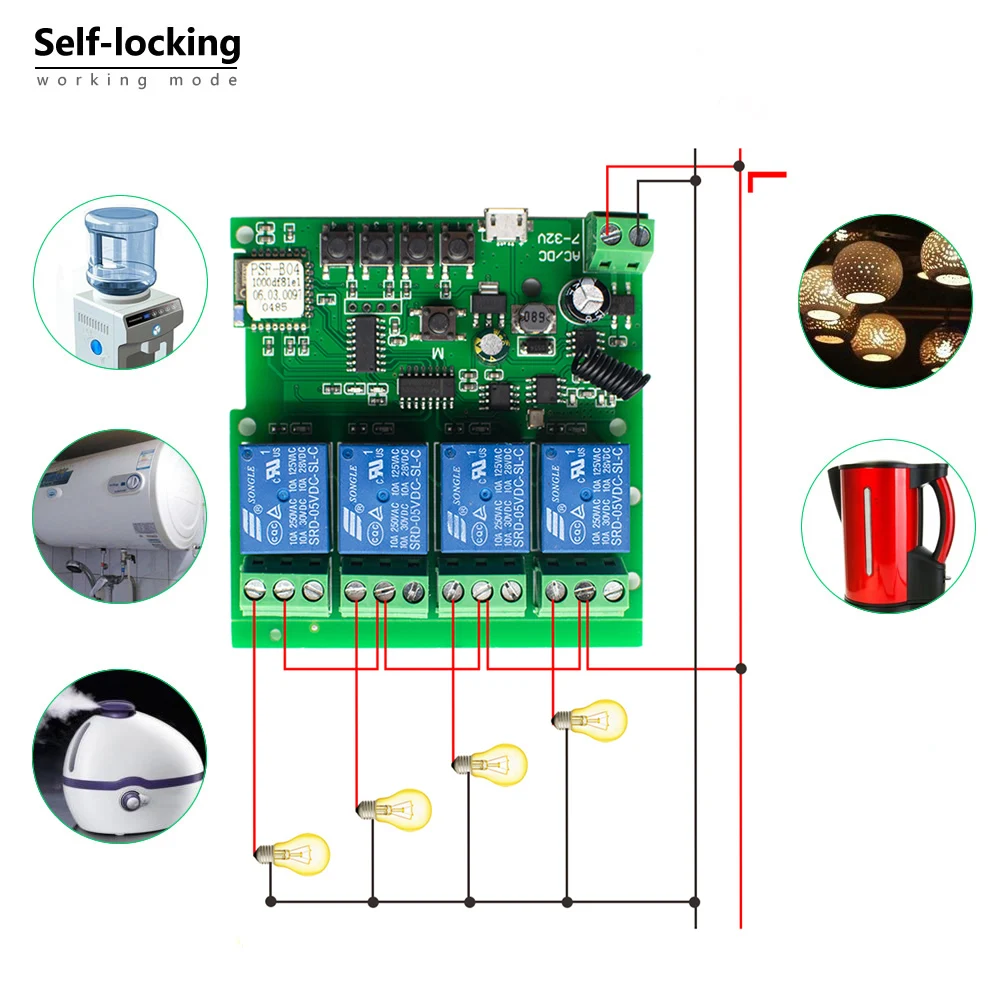 Входное напряжение: DC/AC 7-32V , Micro USB 5V вход. Максимальный ток: 220 Вт/10 А. Стандарт Wi-Fi: Wi-Fi 2,4 ГГц b/g/n. Размер: 1CH 69*41*20 мм, 2CH 10*35*20 мм, 4CH 78*74*20 мм. Срок службы реле модели составляет более 1000, 00. Функция инширования по умолчанию: нажмите на открытое реле на мобильный телефон, а затем Отрежьте натяжение автоматически, вы можете установить время инширования в приложении, он имеет функцию распределения времени одновременно. Самоблокирующийся при нажатии кнопки «инчинг» и «запирающий» светильник. Нажмите открыть реле для включения, Нажмите закрыть реле для отключения.