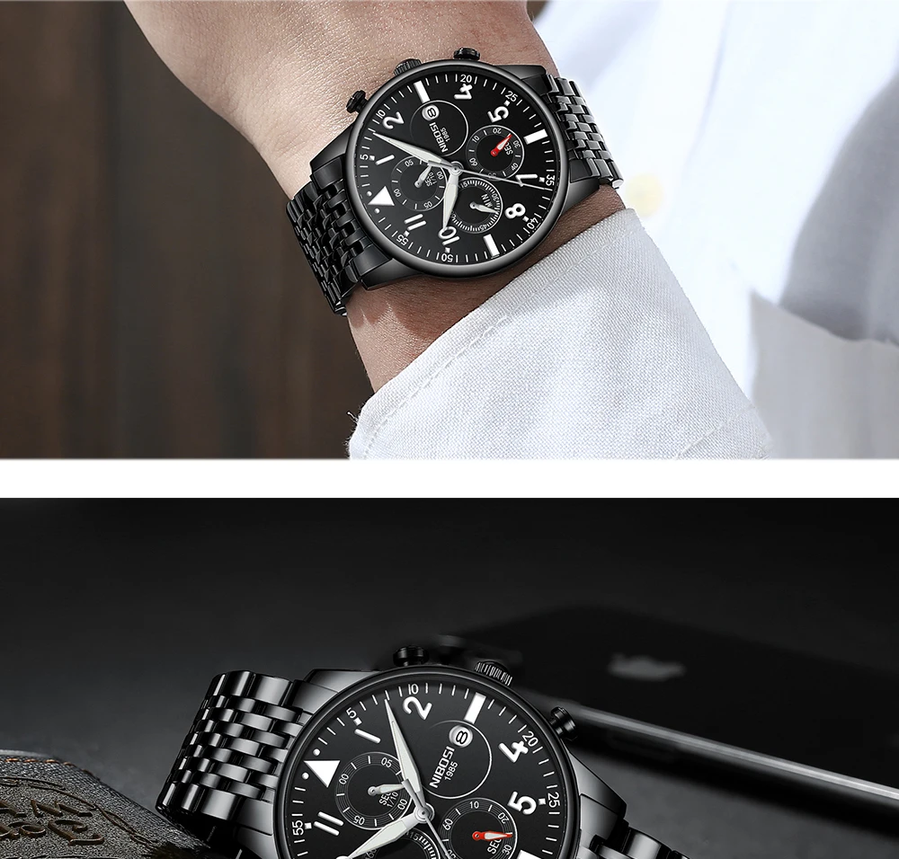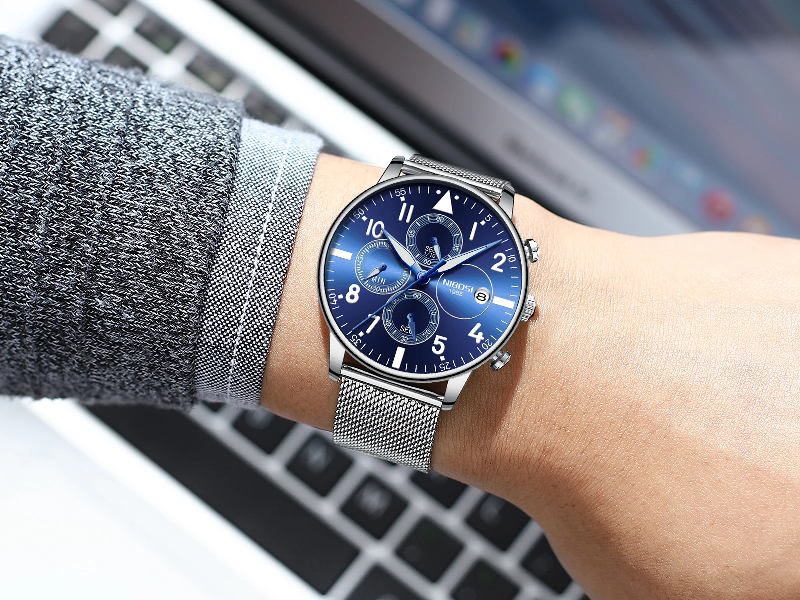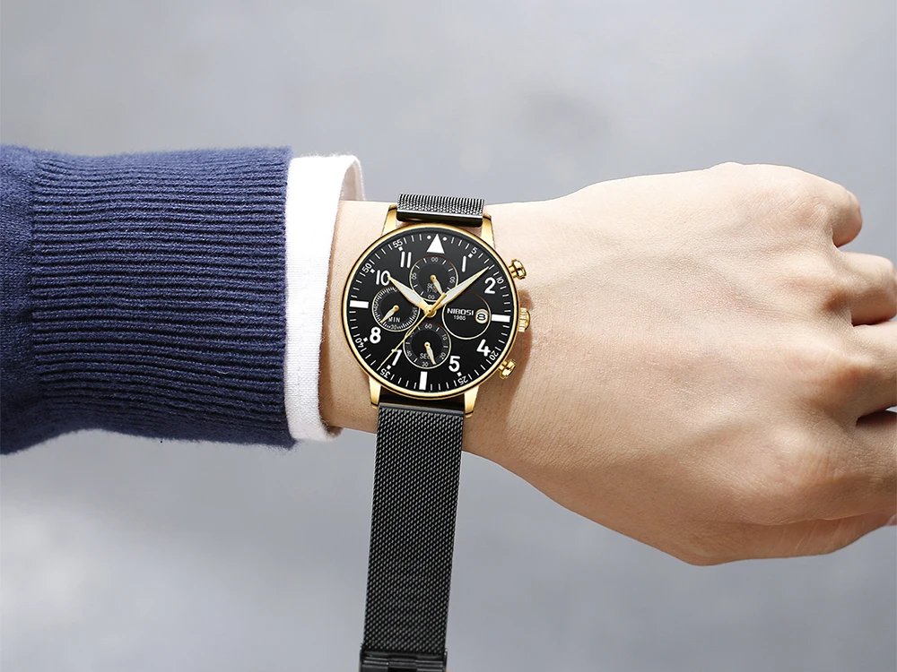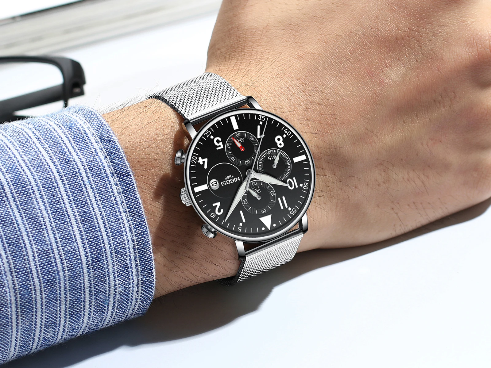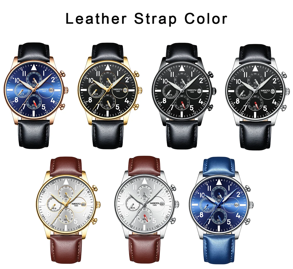 -1 x часы NIBOSI-1 x коробка NIBOSI-1 Инструкция-1 х ткань для чистки часов-1 гарантийный талон-1 инструмент для регулировки ремешка