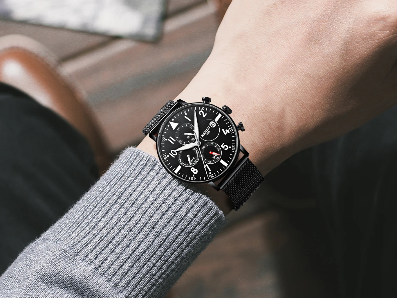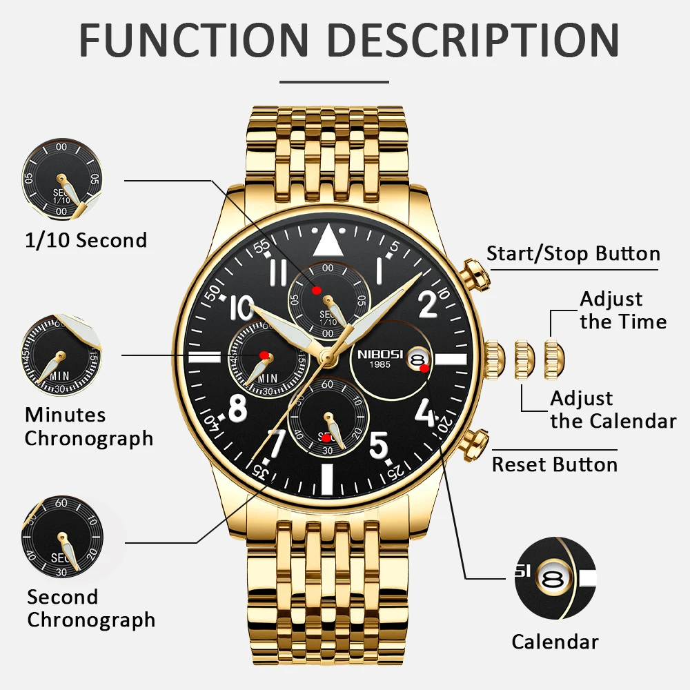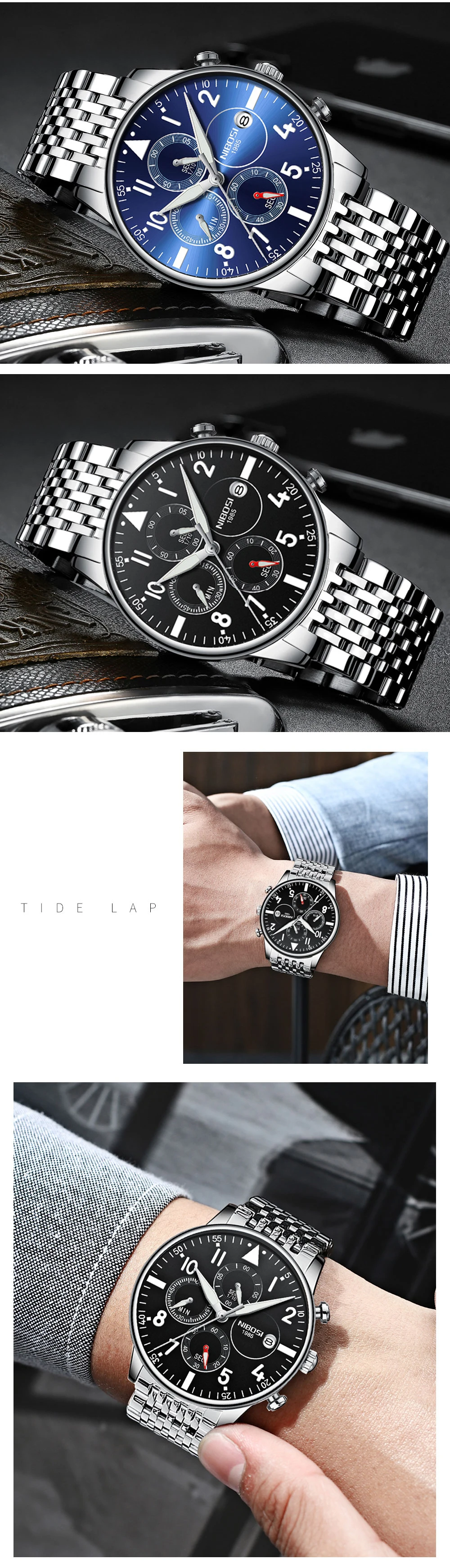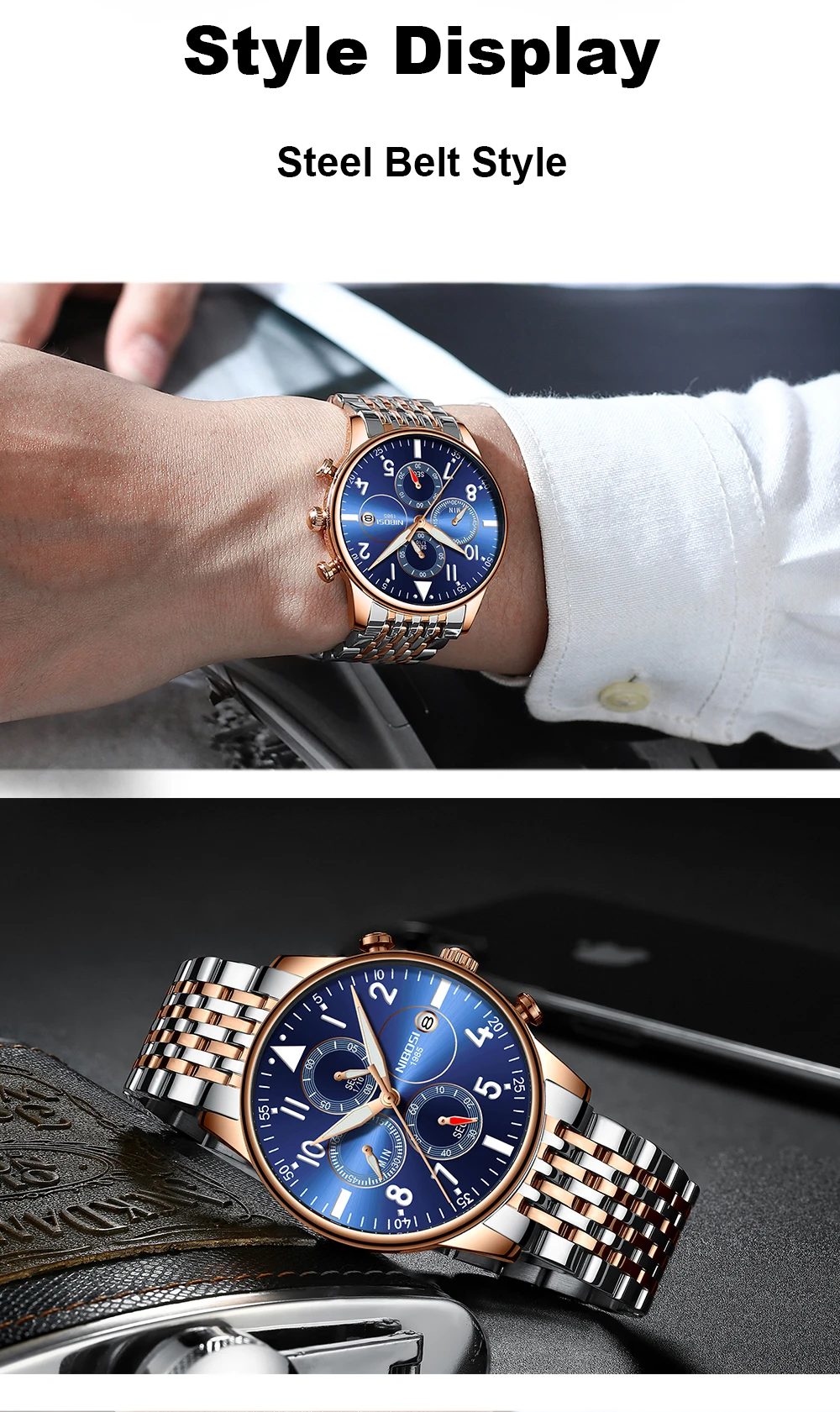 -1 x часы NIBOSI-1 x коробка NIBOSI-1 Инструкция-1 х ткань для чистки часов-1 гарантийный талон-1 инструмент для регулировки ремешка