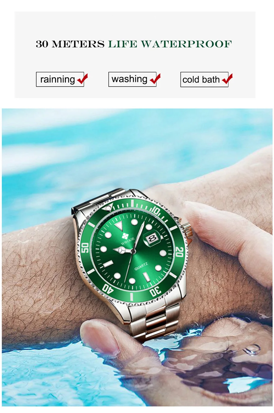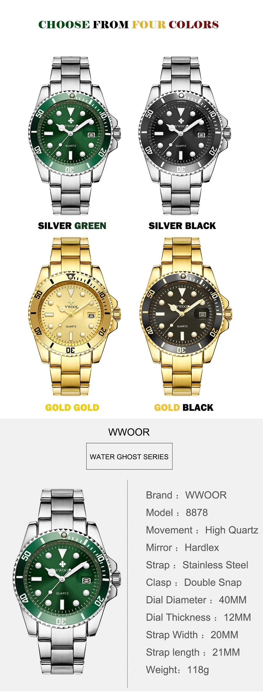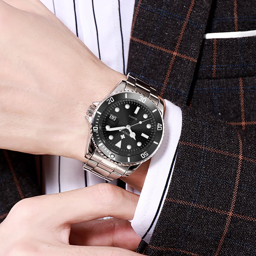 Бренд: WWOOR 8878(2021 Новый)-Дисплей: аналоговые кварцевые часы-Стиль: Модный, Деловой, роскошный, простой-Особенности: Водонепроницаемость, ударопрочность, плавание, Автоматическая Дата,Основная особенность:-3 АТМ/30 М Водонепроницаемость (поддержка холодного душа и плавания, не использовать часы под водой, не поддерживать горячую воду);-Качественный чехол из цинкового сплава;-Качественная полоса из нержавеющей стали;-Чехол Диаметр: 4,0 см-Чехол Толщина: 1,2 см-Диапазон Ширина: 2,0 см-Общая длина: 21 см Посылка включает в себя:-Часы WWOOR-1 шт.-1 x Подарочная коробка WWOOR-1 x чистая ткань-1 инструмент для регулировки ремешка