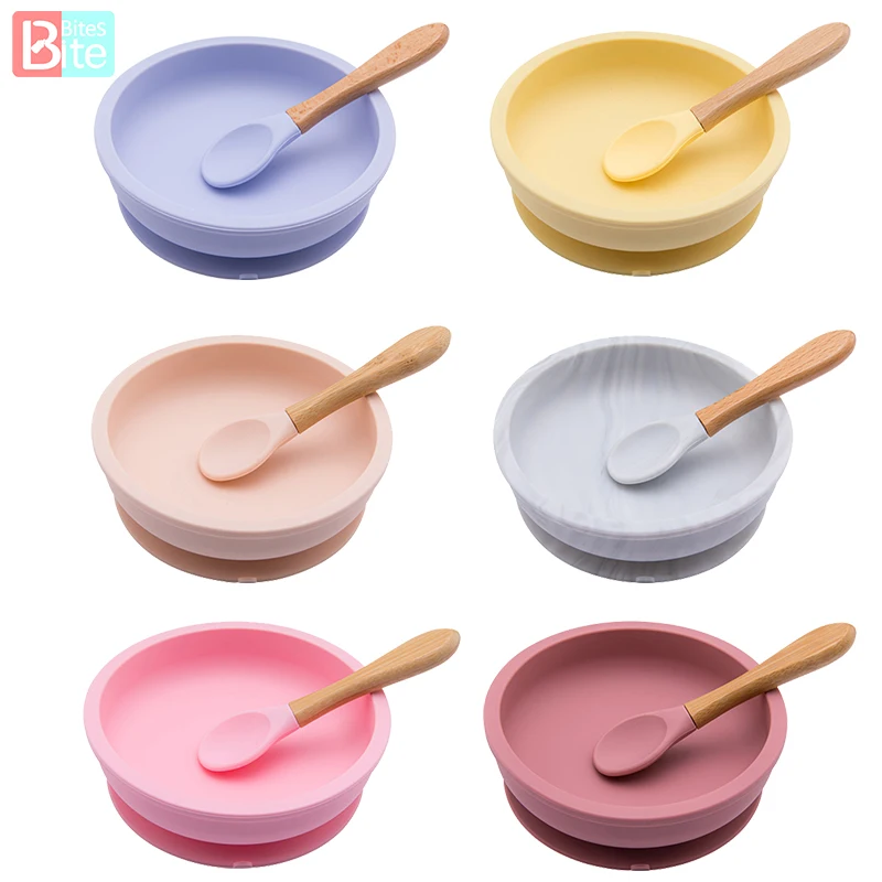Чаши для кормления младенцев, присоска с деревянной ложкой, Нескользящие, из силикона, для начинающих ходить детей