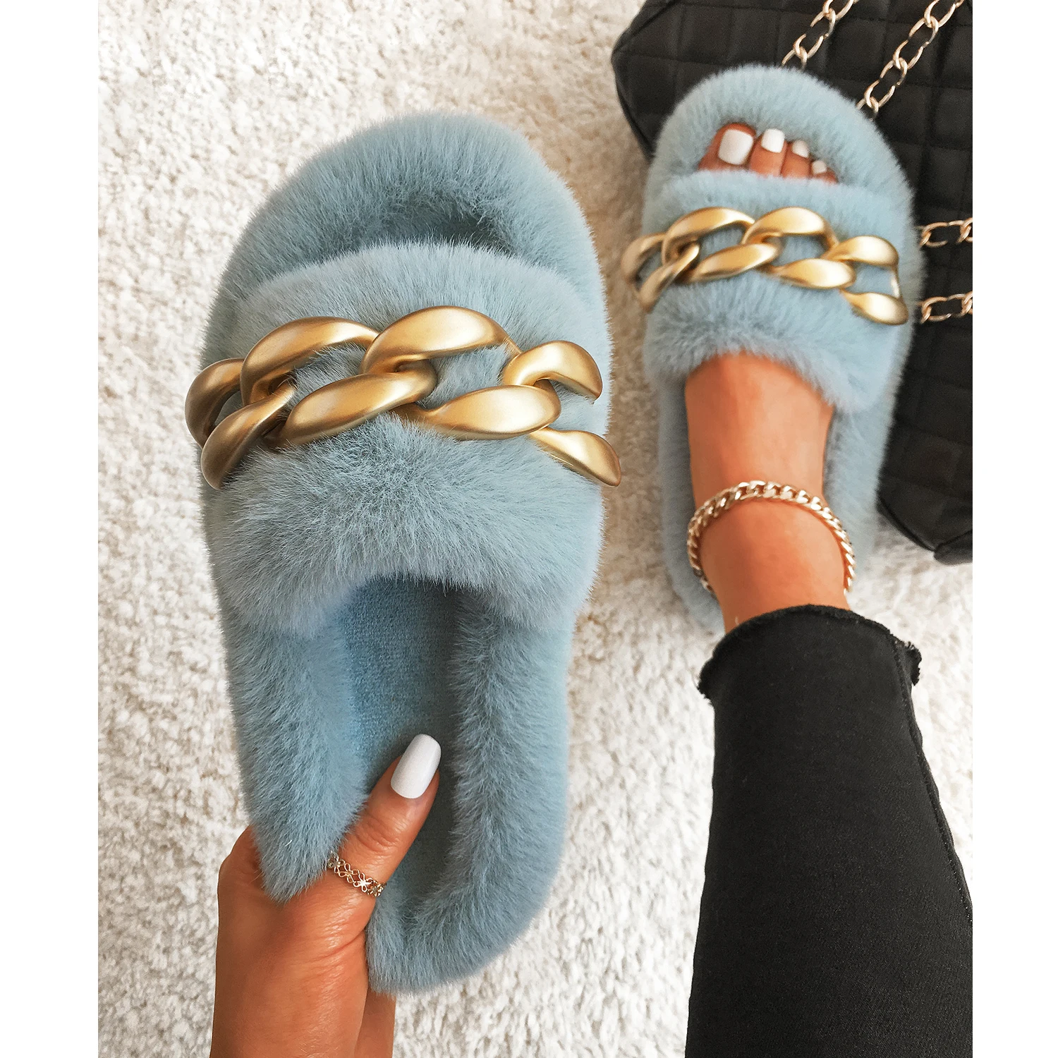 Меховые сланцы для женщин, плюшевые домашние тапочки с золотой цепо...